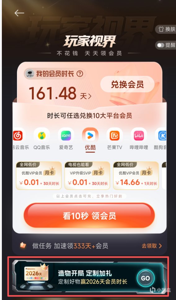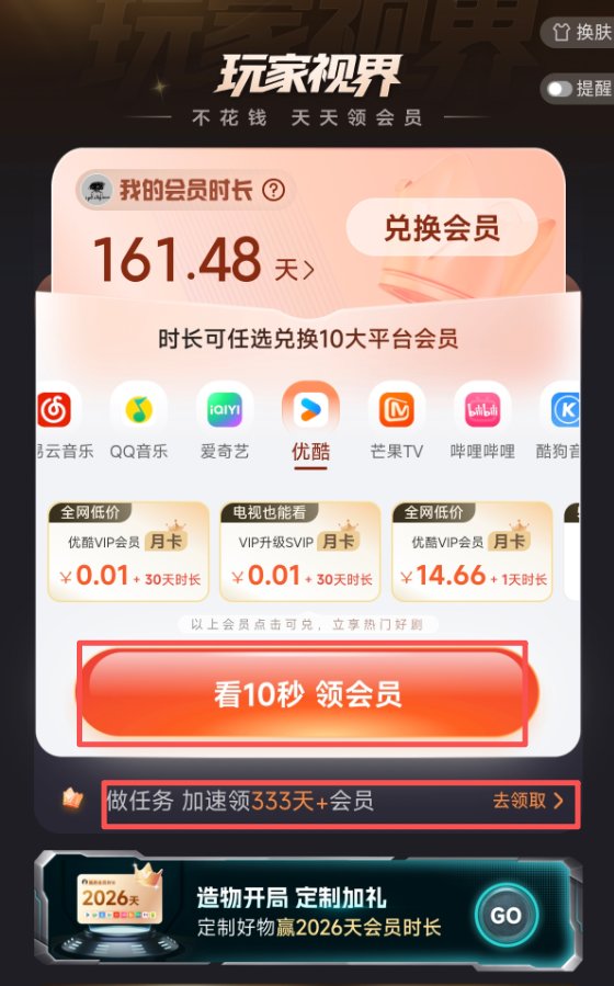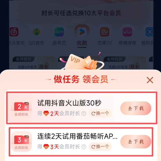 可以在 领视频会员 界面每天开10s广告去获取时长,获得天数不稳定;也可完成下面的任务下载app体验30s,会有两种一种是当天体验30s得2天时长,还有一种连续体验两天30s得3天时长,任务完成后第二天会刷新,可以重复完成,这样每月获得的时长都会超过31天。