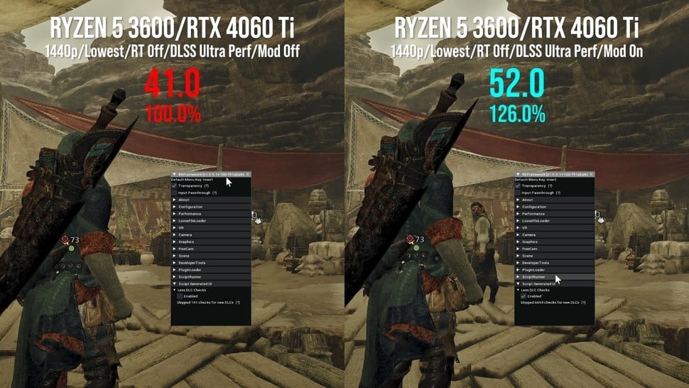 在所述條件下,模組作者的結論完全成立。Digital Foundry理查德·萊德貝特使用銳龍5 3600 CPU測試系統發現,"減少DLC驗證"模組帶來的性能提升隨畫質設置降低而顯著增強: