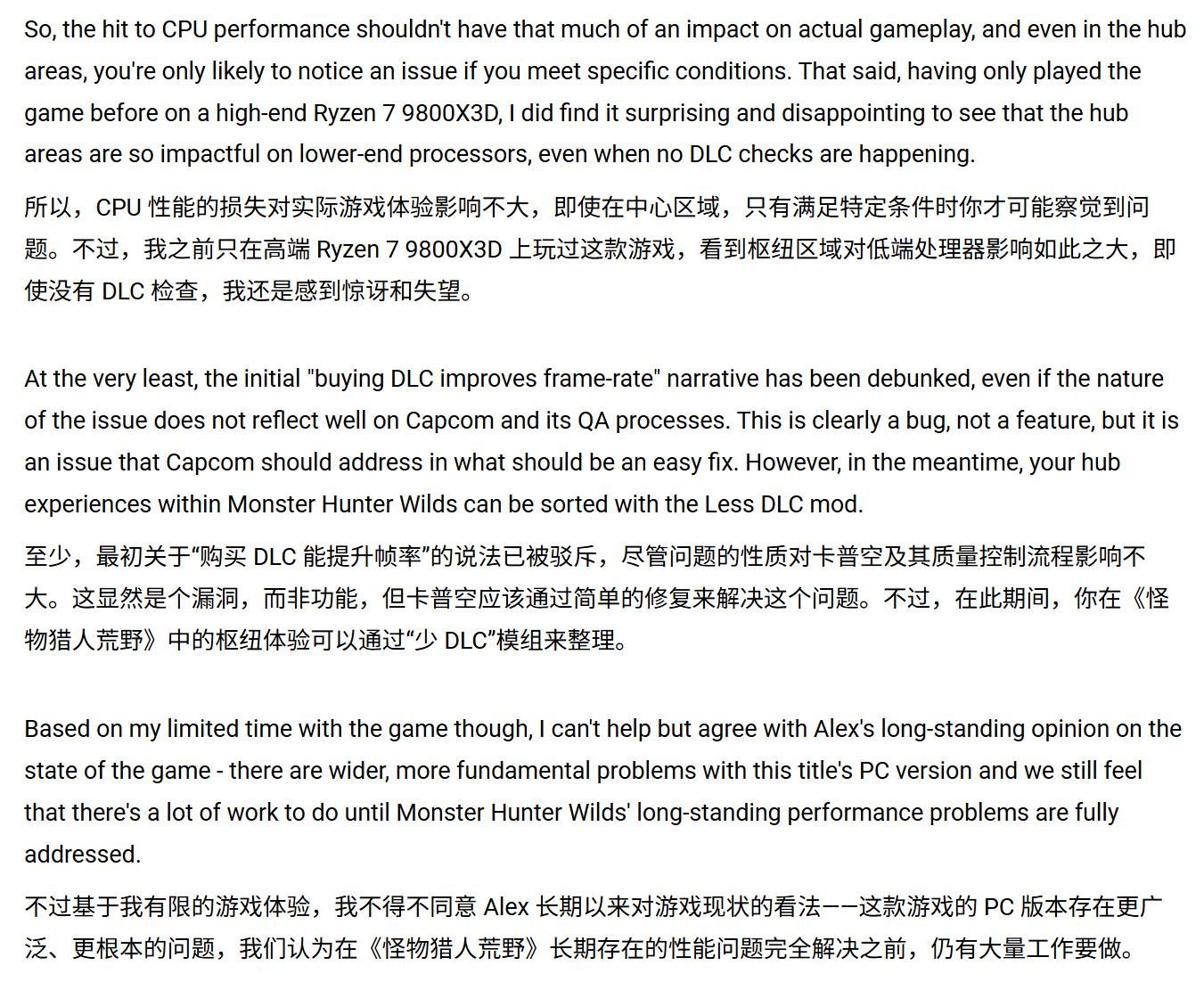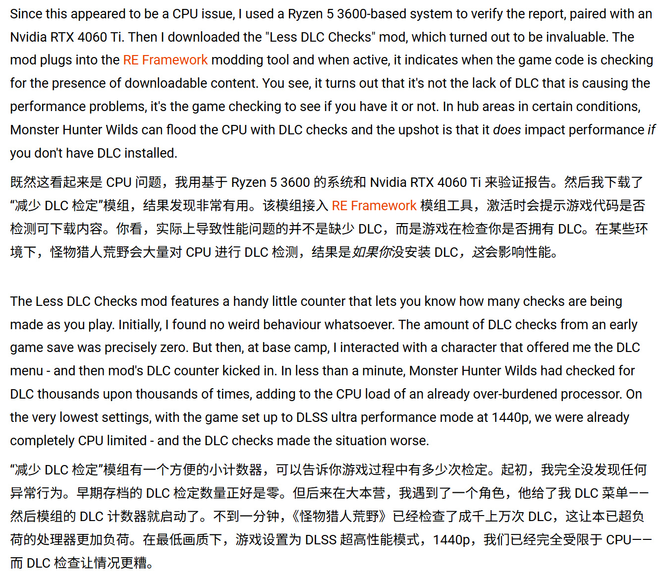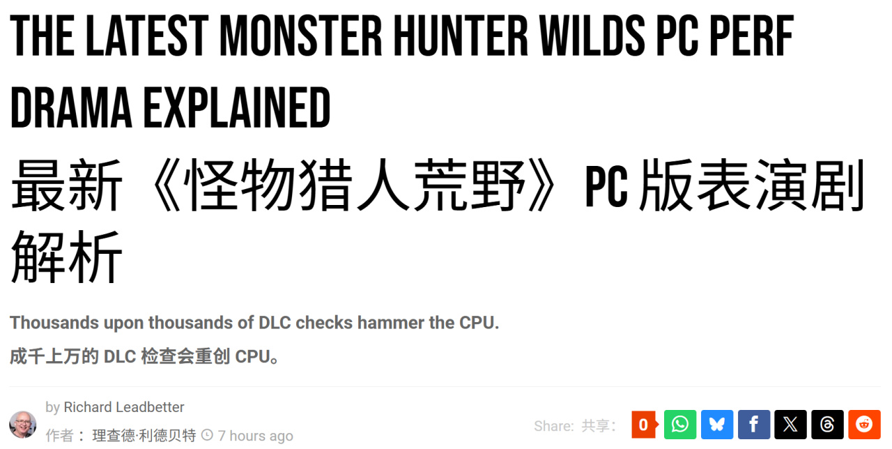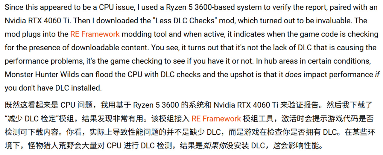 Digital Foundry技術團隊已確認,《怪物獵人:荒野》PC版確實存在"數千次"DLC驗證拖累遊戲性能的現象,但該問題僅發生於特定場景。