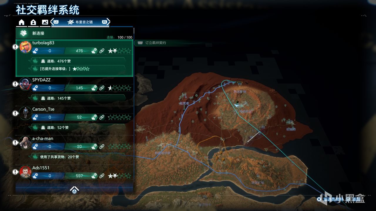 這個機制的原理就是,在聯網遊玩的前提下(不需要開通PSN會員),一個玩家可以和若干玩家建立社交羈絆關係。建立了社交羈絆關係的玩家之間,在已經接入開羅爾網絡的區域 ,相互之間可以共享部分建築、載具、材料、武器裝備、任務等。因此,對於新手玩家來說,和其他大佬玩家建立起社交羈絆關係,那麼就可以在遊戲中享受到大量大佬玩家帶來的福利,可以極大地改善遊戲體驗。