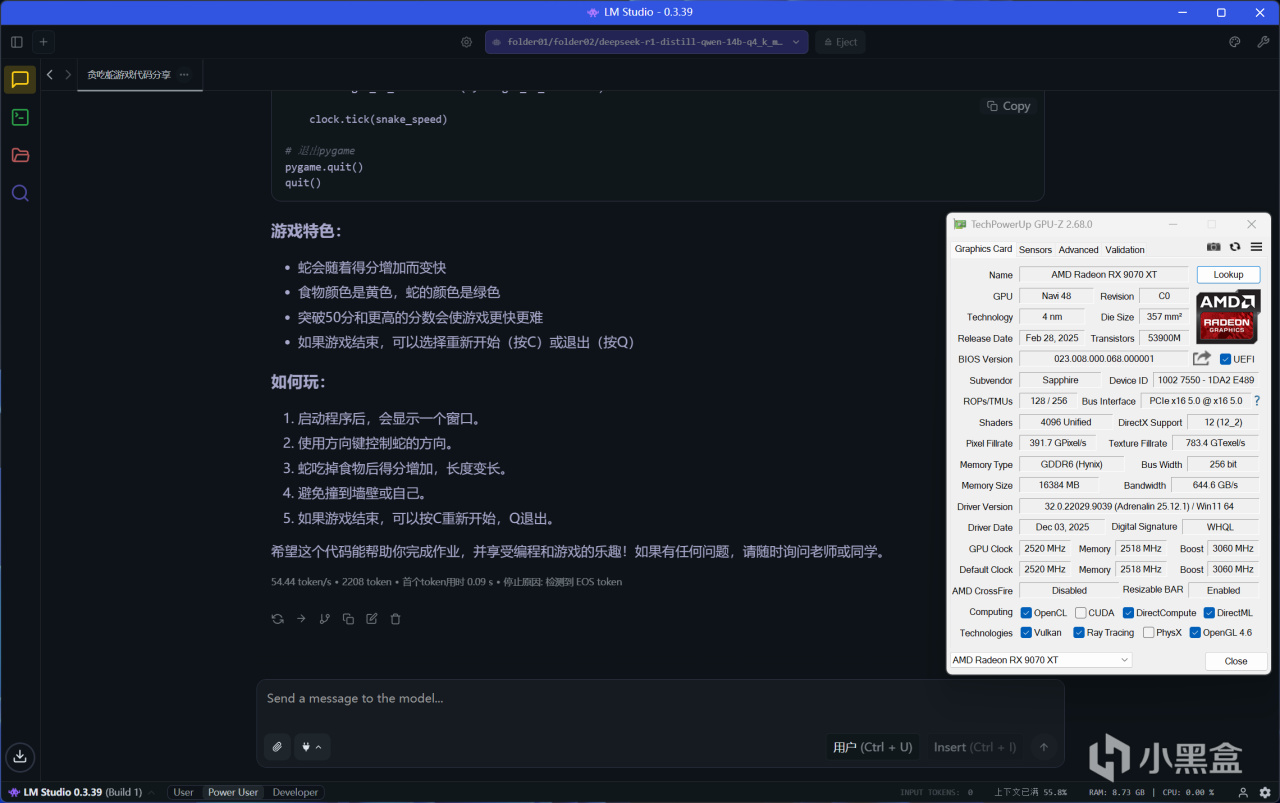 RX 9070 XT使用AMD ROCm模式运行DeepSeek R1 Distill Qwen 14B大模型(GPU卸载MAX),推理速度达到54.44 token/s