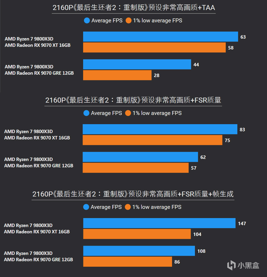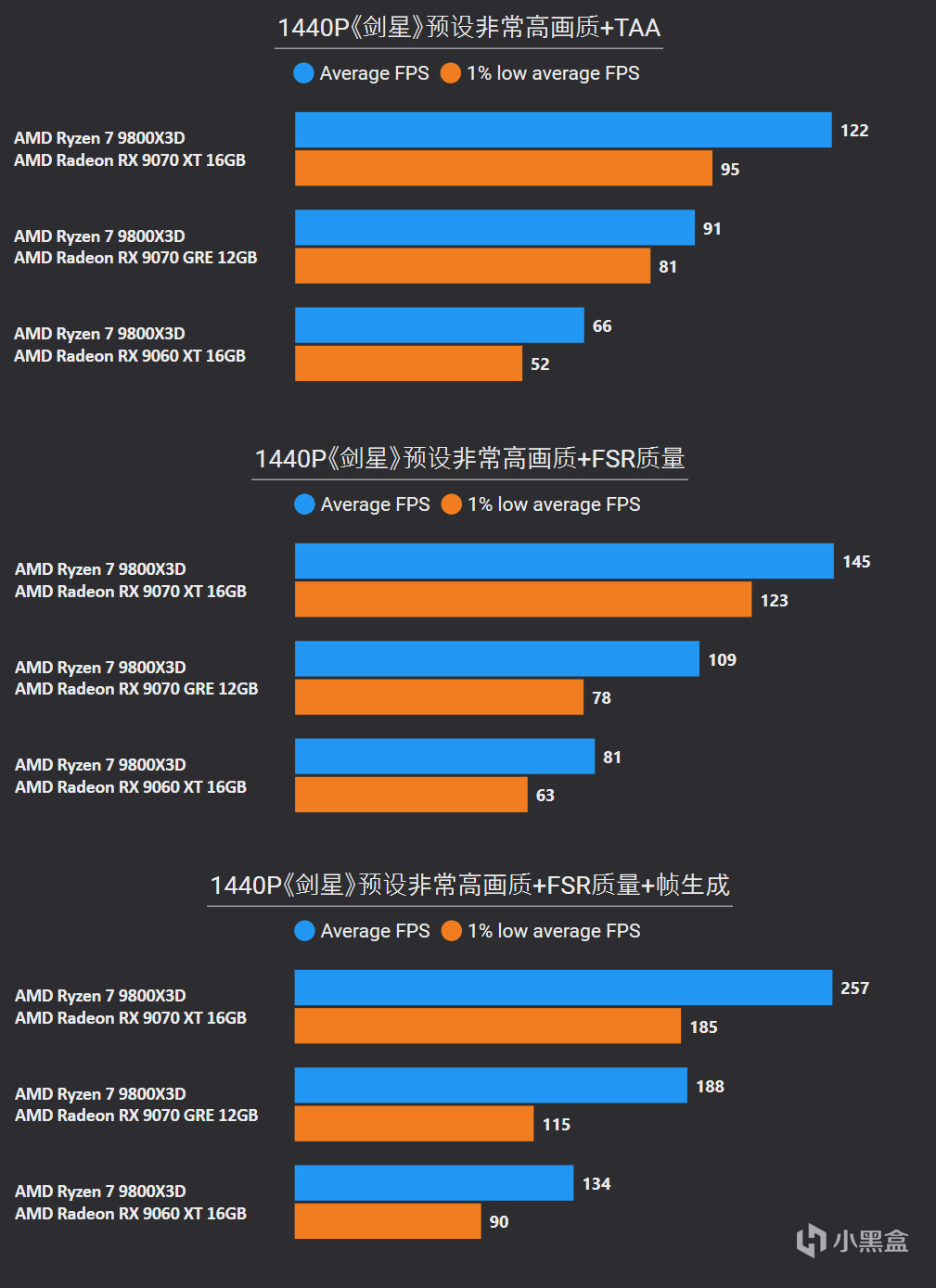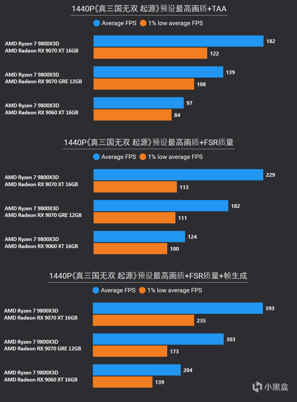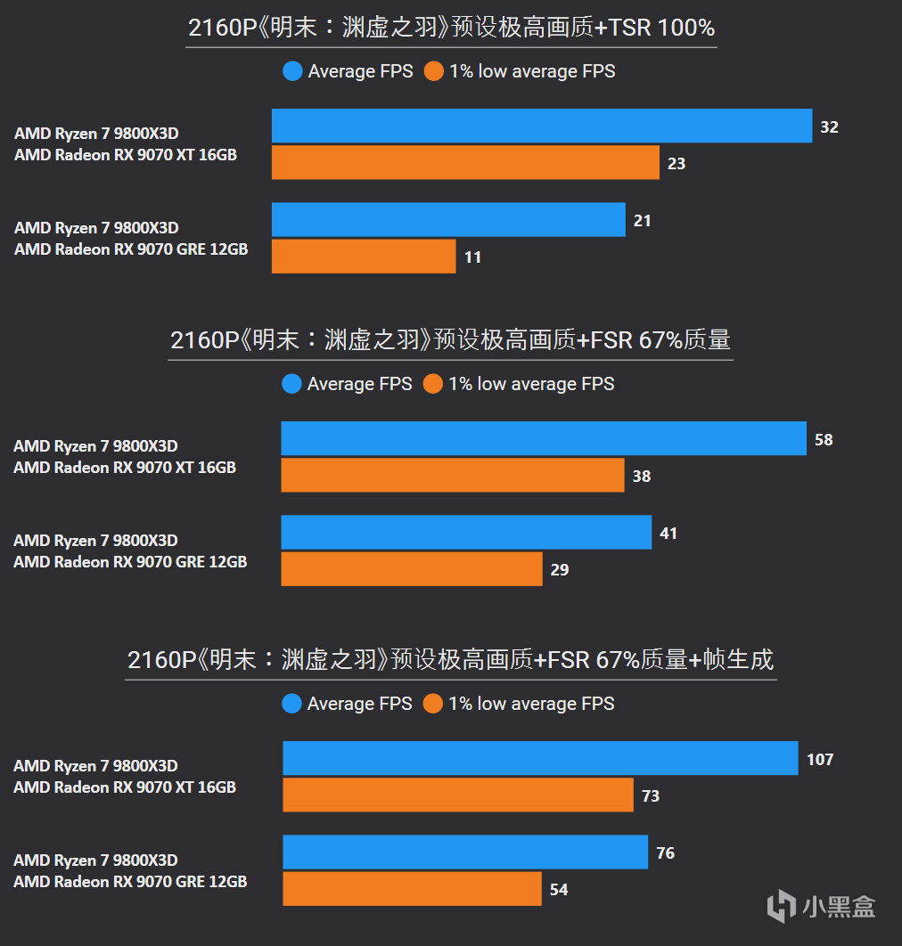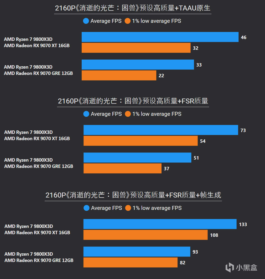 对于2K分辨率,开启原生抗锯齿情况下,RX 9070 XT所有游戏都能轻松跑满60fps+,有一半游戏能超过100fps高帧标准,而且在使用FSR质量档后,因为所有游戏都能达到80fps+的原始帧率,再叠加帧生成,高帧体验也会更丝滑和跟手。