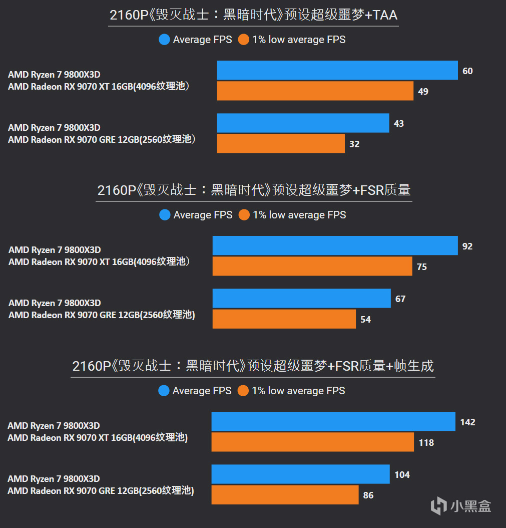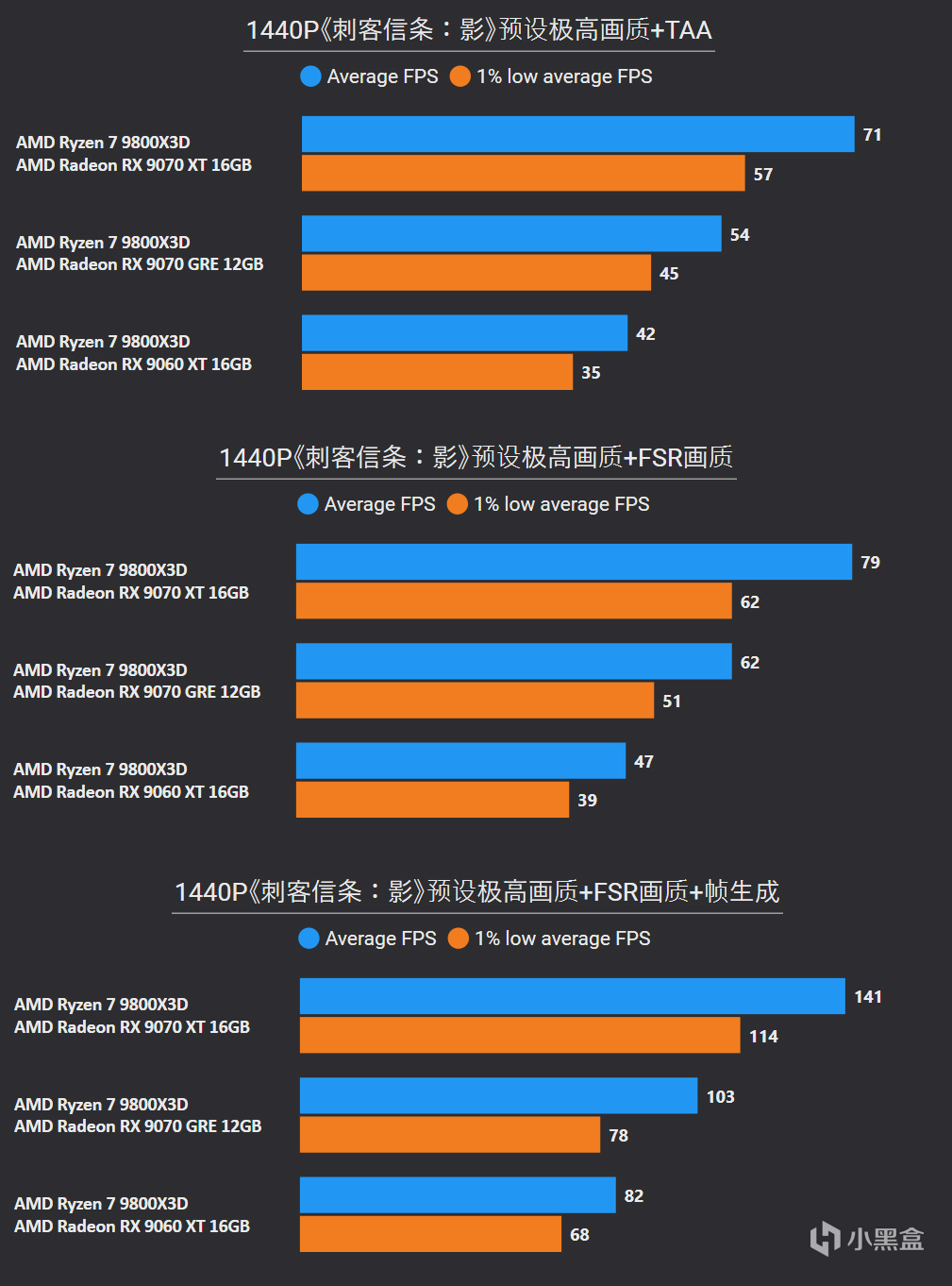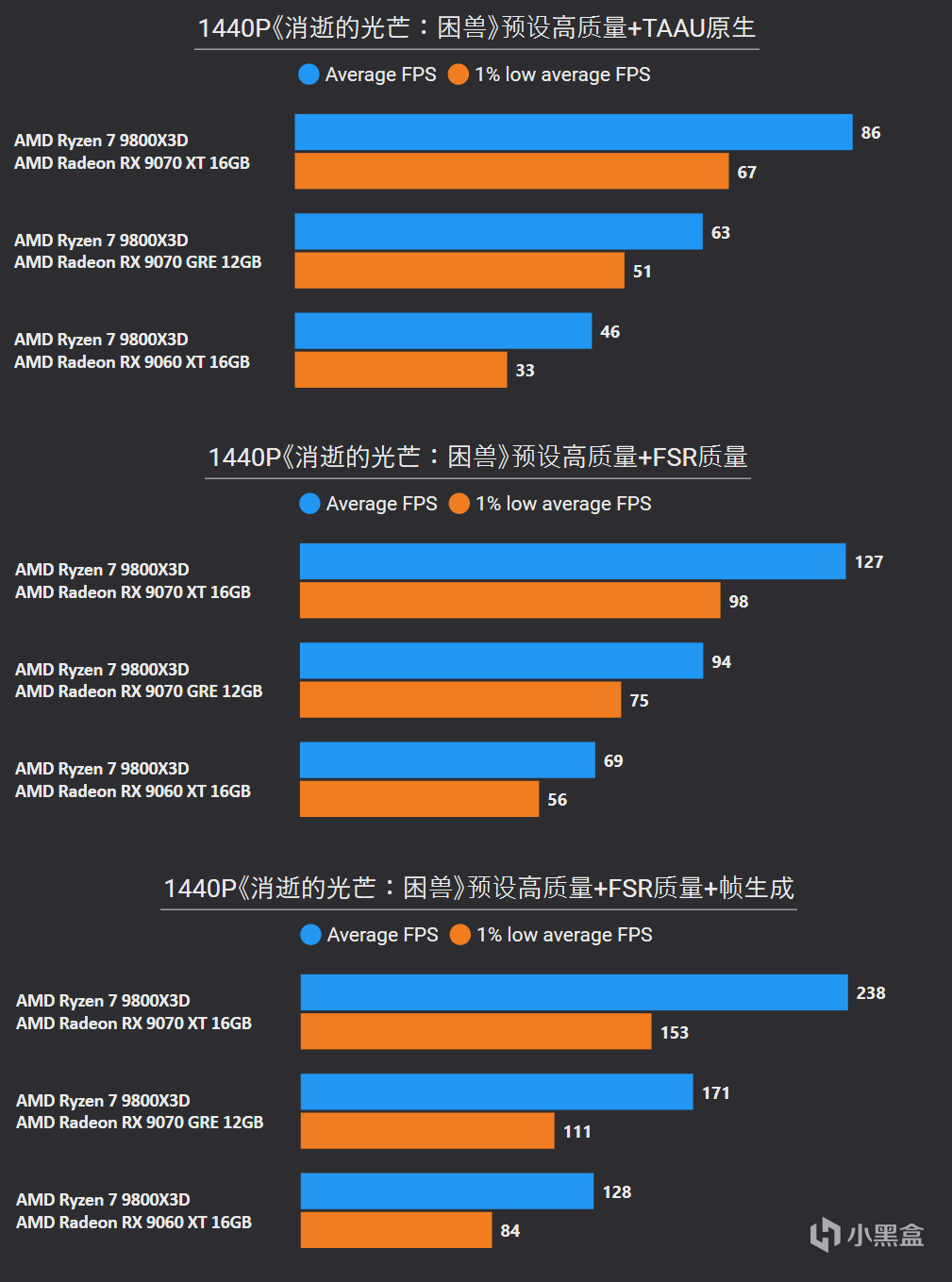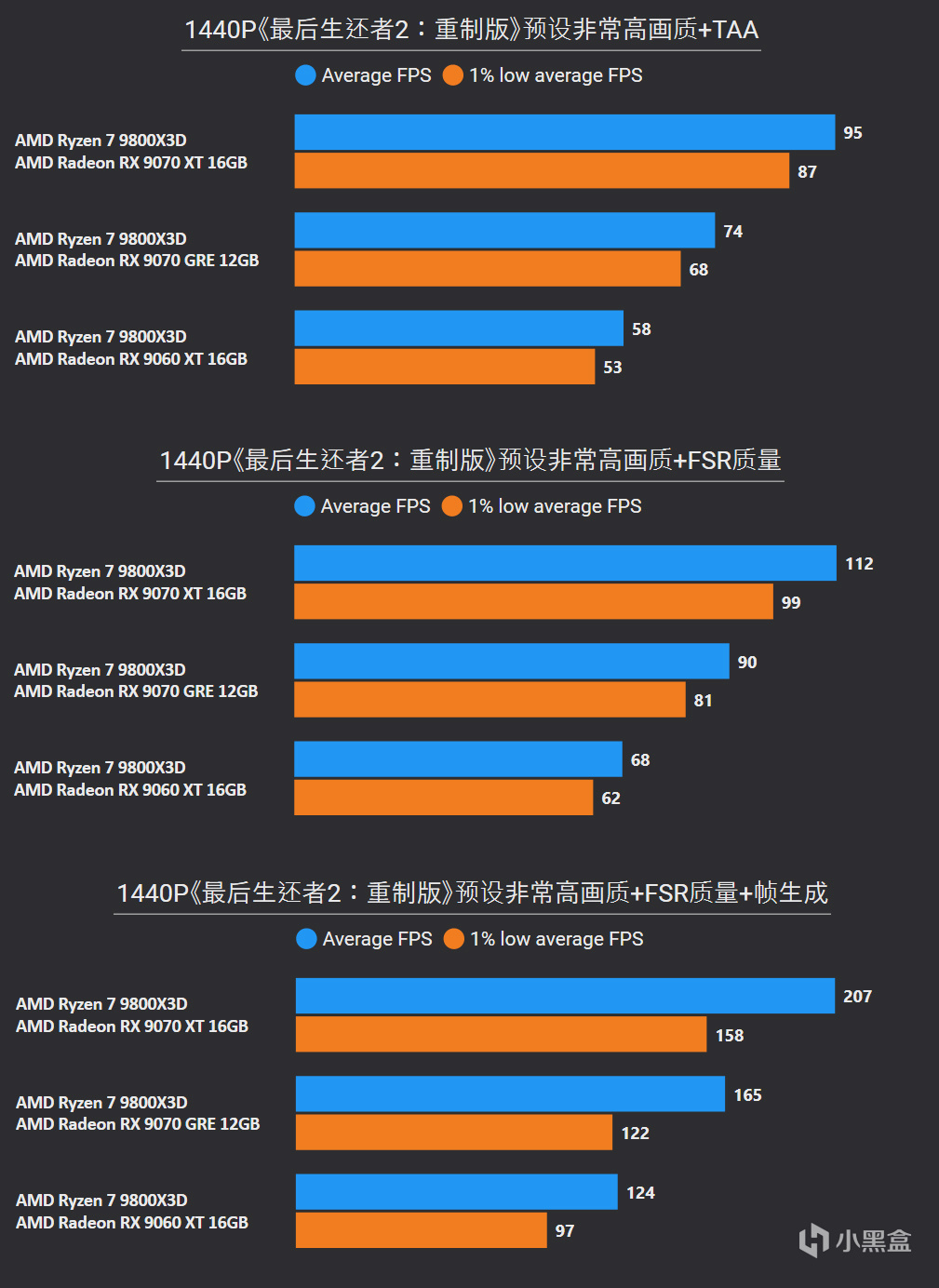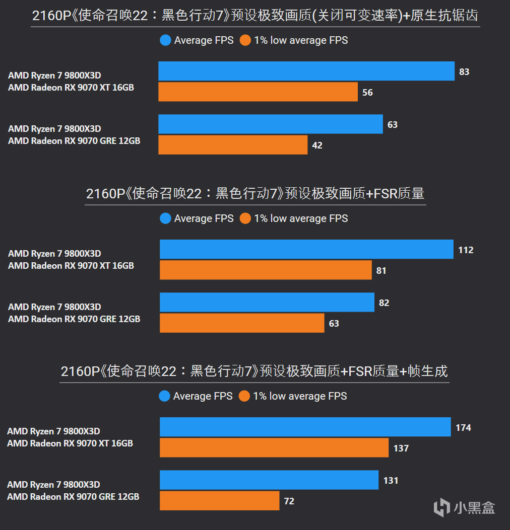 对于2K分辨率,开启原生抗锯齿情况下,RX 9070 XT所有游戏都能轻松跑满60fps+,有一半游戏能超过100fps高帧标准,而且在使用FSR质量档后,因为所有游戏都能达到80fps+的原始帧率,再叠加帧生成,高帧体验也会更丝滑和跟手。