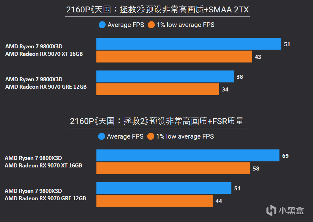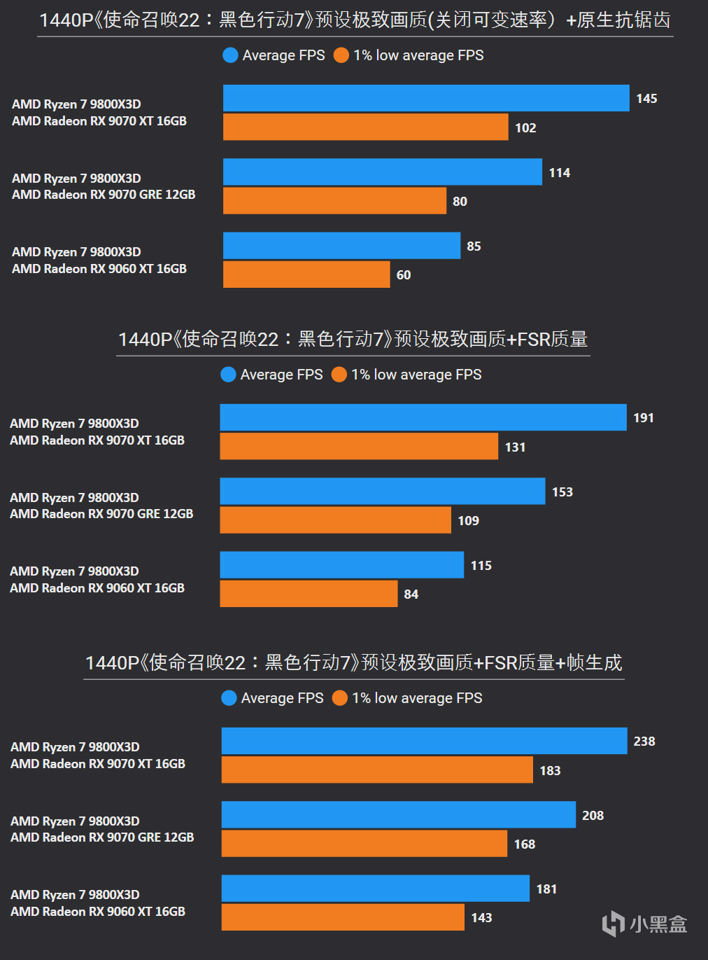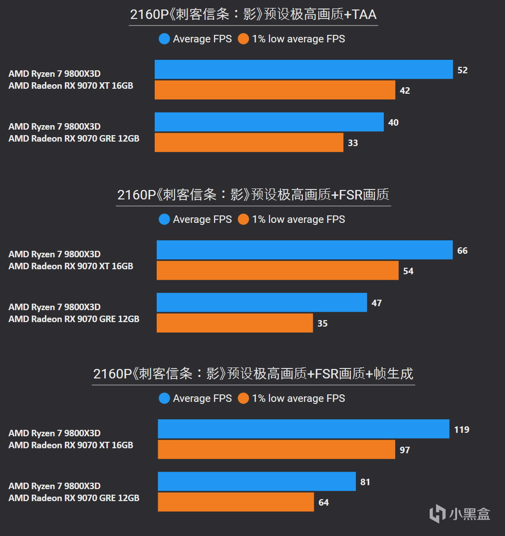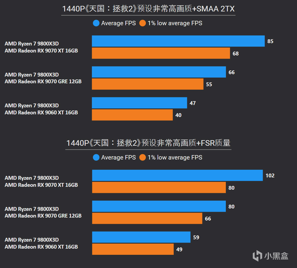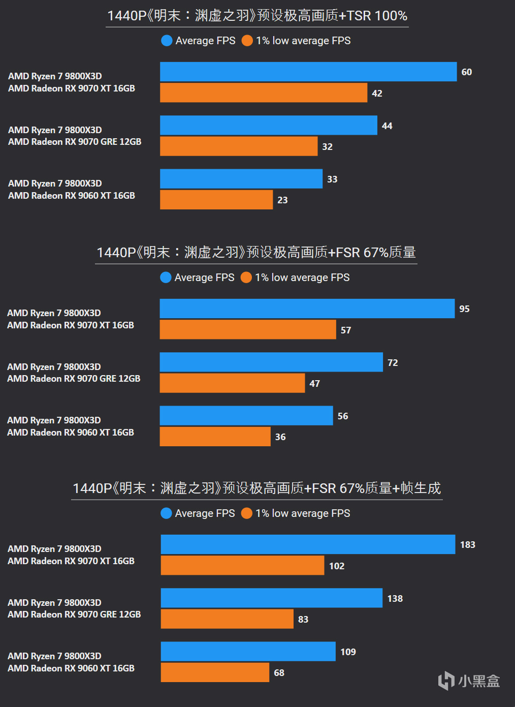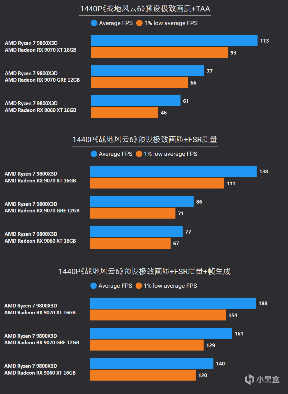 对于2K分辨率,开启原生抗锯齿情况下,RX 9070 XT所有游戏都能轻松跑满60fps+,有一半游戏能超过100fps高帧标准,而且在使用FSR质量档后,因为所有游戏都能达到80fps+的原始帧率,再叠加帧生成,高帧体验也会更丝滑和跟手。