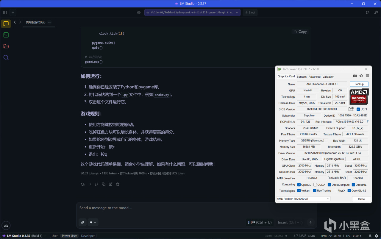RX 9060 XT 16GB使用AMD ROCm模式运行DeepSeek R1 Distill Qwen 14B大模型(GPU卸载MAX),推理速度达到30.83 token/s