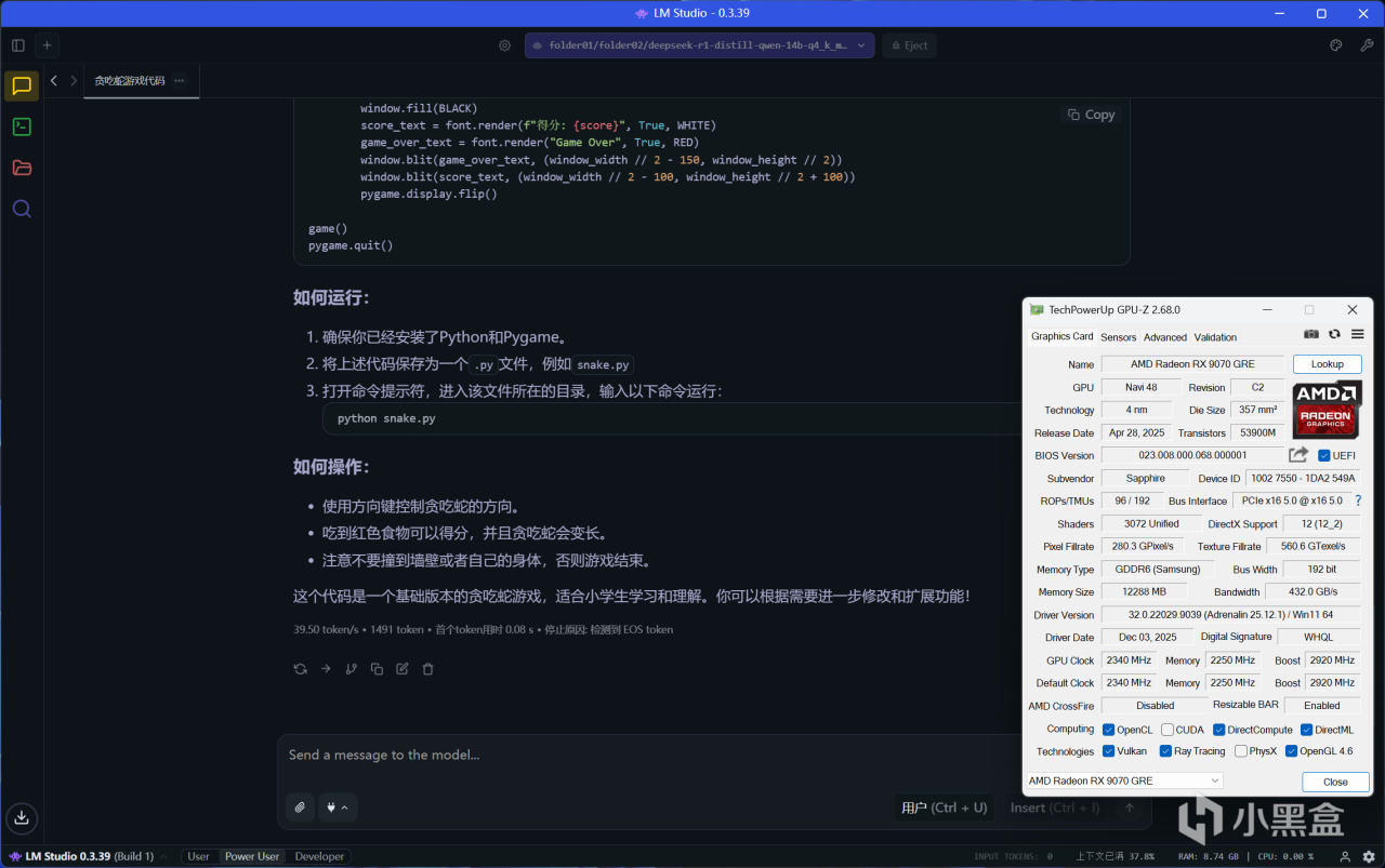 RX 9070 GRE使用AMD ROCm模式运行DeepSeek R1 Distill Qwen 14B大模型(GPU卸载MAX),推理速度达到39.50 token/s