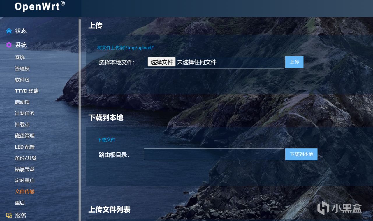 登录后,在左侧选择文件传输(注意,不同版本的openwrt系统可能安装方式不一样,如果本方法安装不了,可以百度一下其他方式)