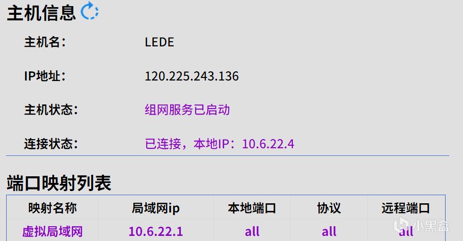 图上显示了几个信息,第二行是旁路由的真实IP,也就是你们家整个局域网的公网IP,这个不用管,没用。下面分别是本机和旁路路由器的虚拟IP。