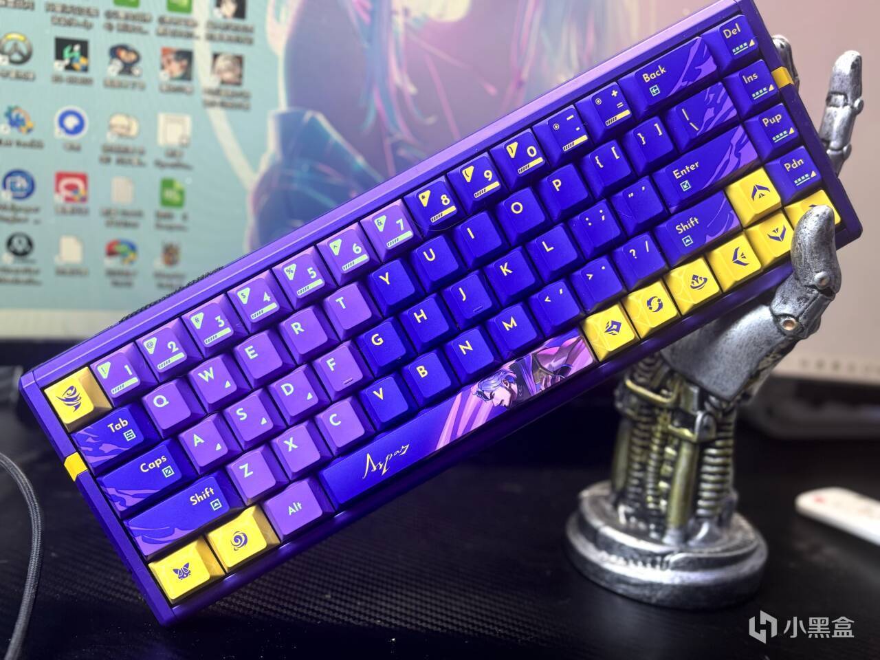 键盘的背面全部都是ASPAS的人物要素,这个铝合金的大背板,我是真的太喜欢了。特别是在灯光的照射下。质感直接拉满了!而且金属格栅以及铭牌都挺帅的。