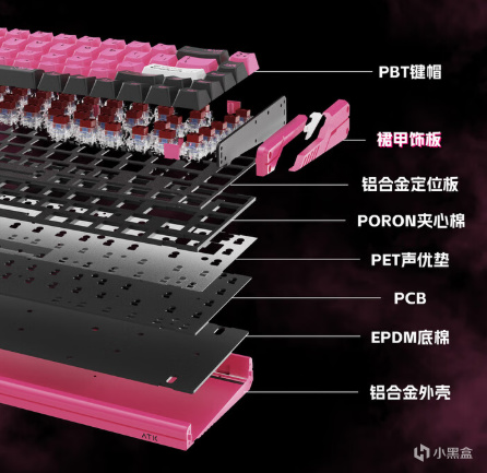 在填充方面,为了追求极限的性能,所以放弃了轴下垫,不过其他的填充都拉满了,像是Poron夹心棉,PET声优垫以及EPDM底棉,而且再加上铝合金的定位板,按压下去的手感非常硬朗,声音也很清脆!这才是真正的顶尖 !