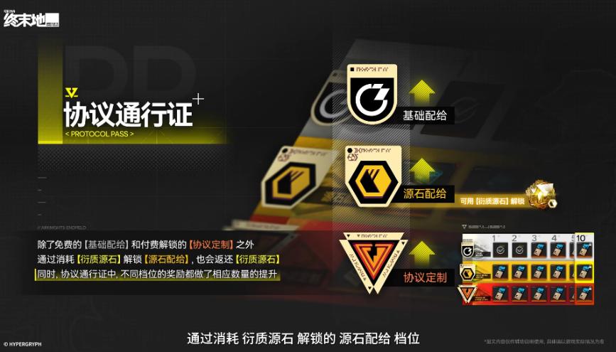 通行证三档,基础的,源石的,花钱的。三档中奖励全部提升,另外源石配给做完会返还源石。