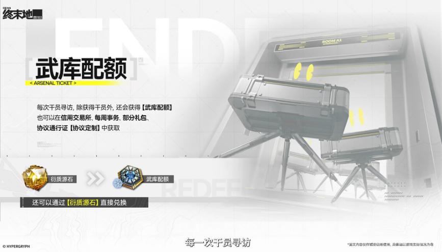 武器池用抽角色和其他渠道获取的配额直接兑换大部分武器,六星武器池四次十连必出一次六星概率歪,八次十连保底。武库同样一个池子开三期。
