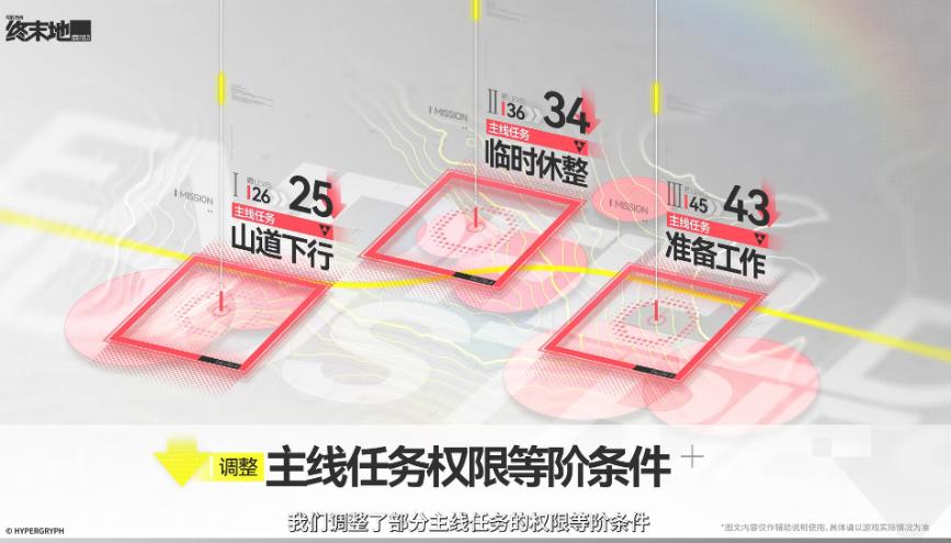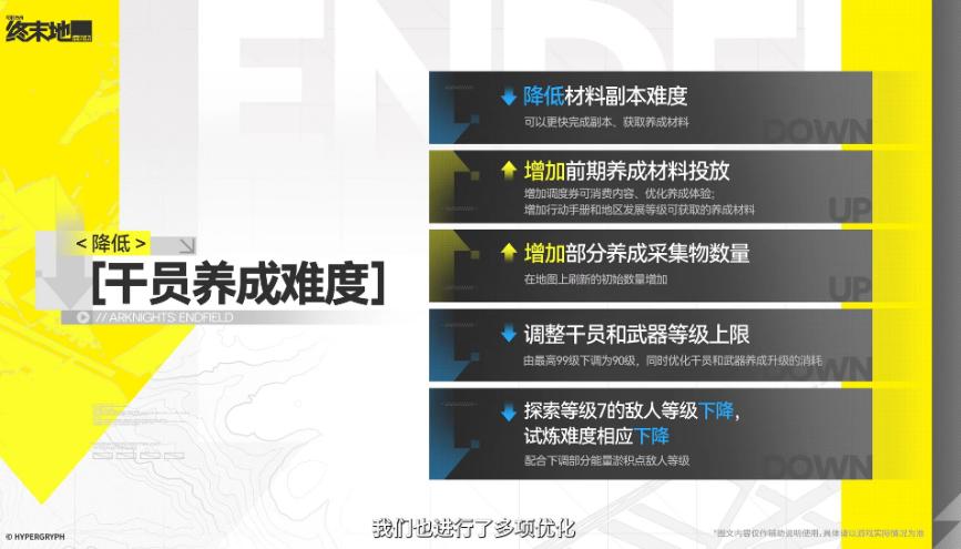 前期养成难度降低,降低材料本难度,增加前期养成材料投放,应该是可以用集成工业的券兑换的上限提升,采集物也就是角色晋升武器晋升材料更多,干员武器等级上限降低减少养成消耗,探索等级7的敌人等级下降,各种试炼的难度下降。