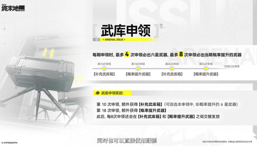 新增第十次申领获得自选六星武器箱,十八次获得概率提升武器箱,之后每八次申领两种箱子交替发放。