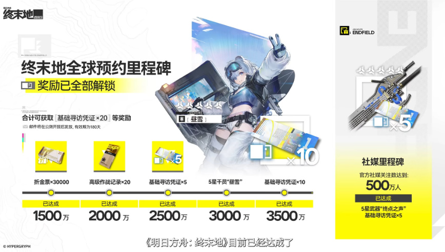 另外预约里程碑奖励上线就领包括20抽普池券,30000块钱,20个高级经验书,五星冰系角色昼雪,五星武器“终点之声”