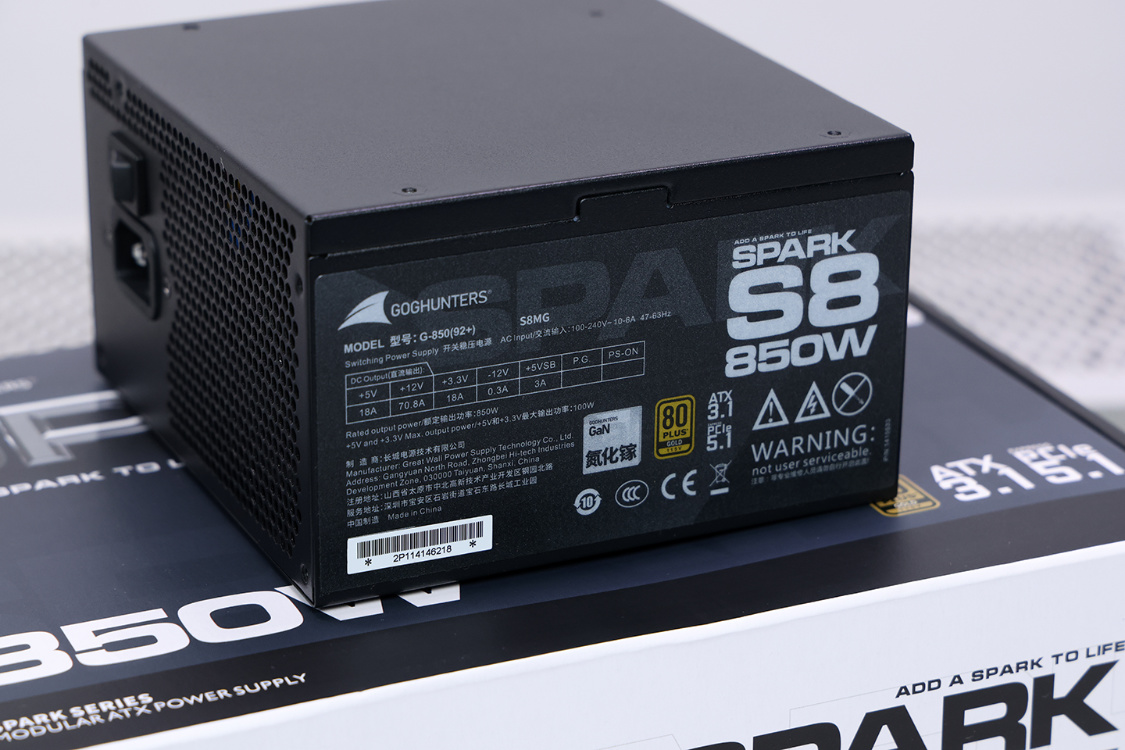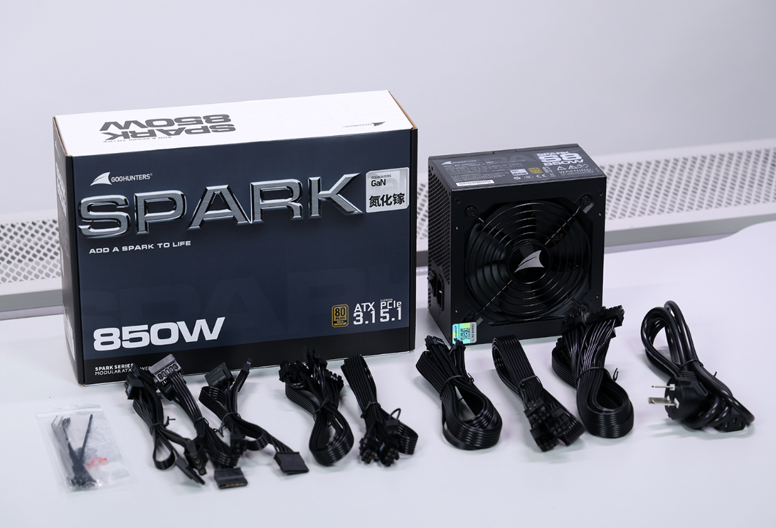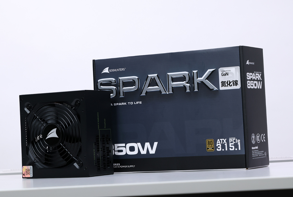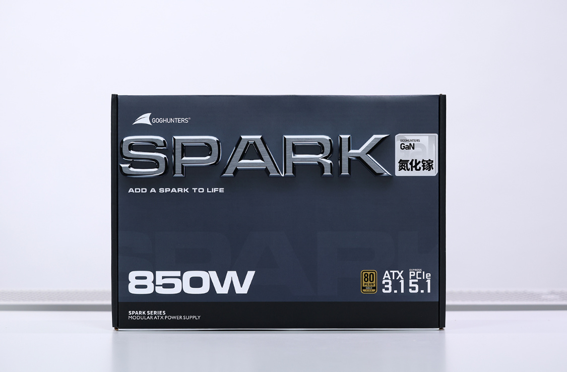 RTX50显卡正当时,首选ATX 3.1和PCIe 5.1的新电源应该没人反对。还想来点更特殊的,那试试这款长城SPARK 850氮化镓金牌全模组电源。蓝灰配色的彩盒包装,金属质感的“SPARK”,质感拉满。另外,外包装上还有氮化镓(GaN)、ATX 3.1、PCIe 5.1以及80Plus认证等标识。