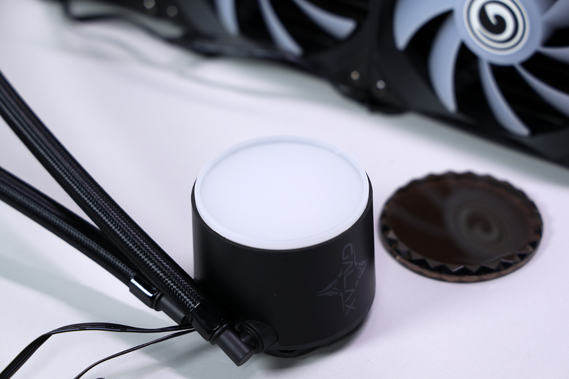 水冷出厂预装三把ARGB风扇,风扇之间使用一线通的隐线设计(PH2.0-7Pin接口),可以有效降低装机理线难度。冷头顶部是一块经过暗化处理的亚克力顶盖,下方是ARGB发光件,可拆结构也就意味着玩家可以对顶盖进行个性化DIY设计。