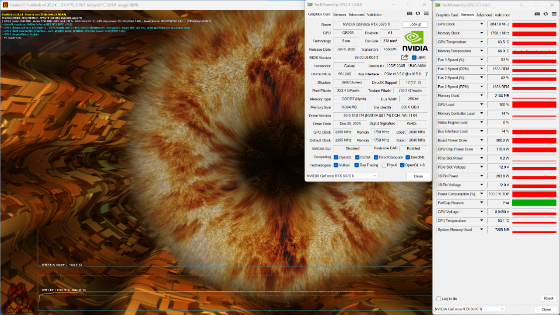 Furmark 烤机,显卡温度为64度左右,显卡功耗300W左右。