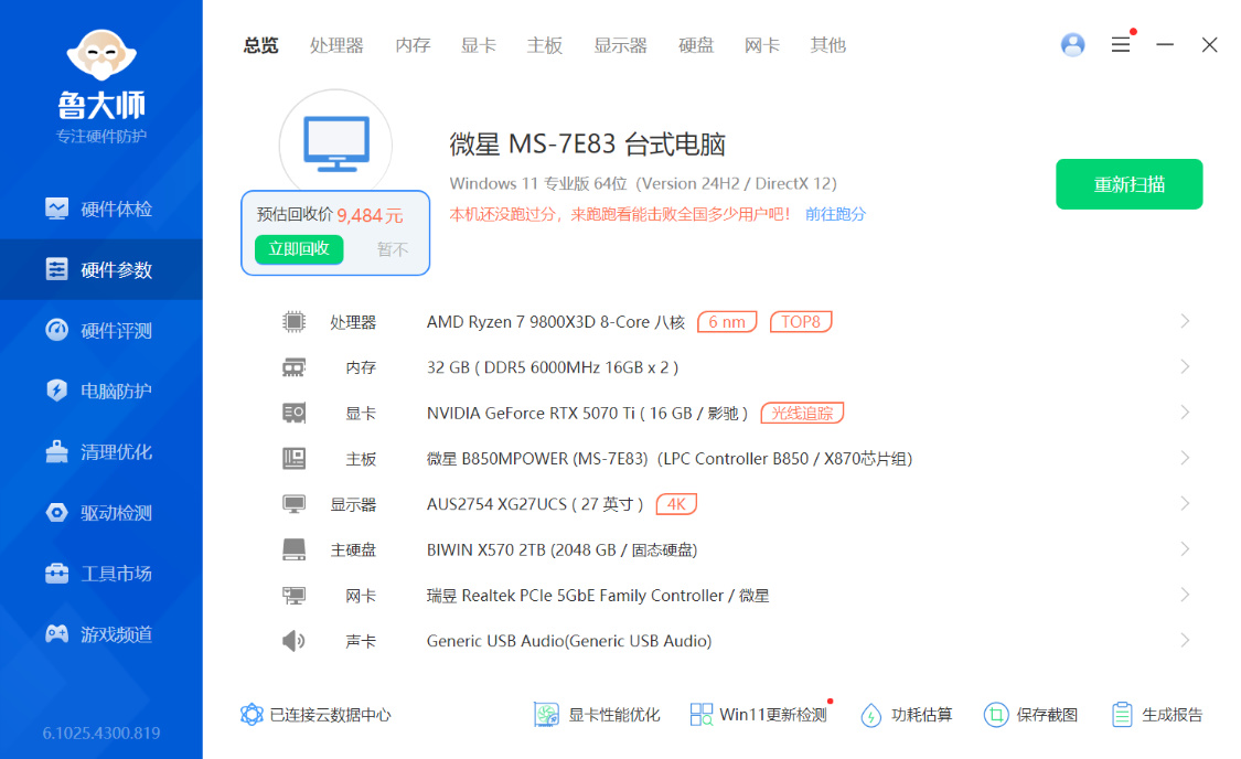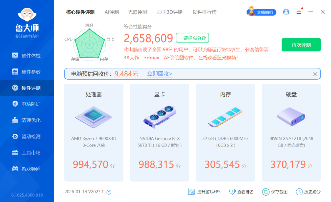 鲁大师配置界面,整机整机得分265.8W分,大师评估回收价9484,这是刚装就给我打了个五折。