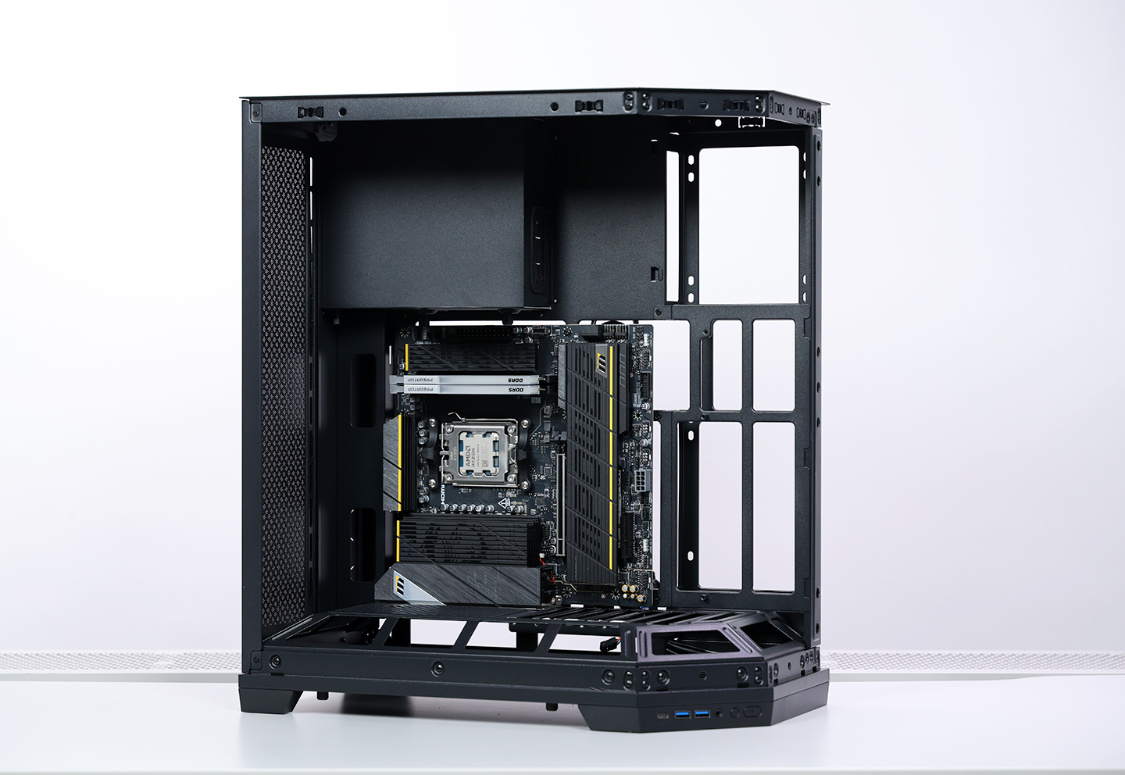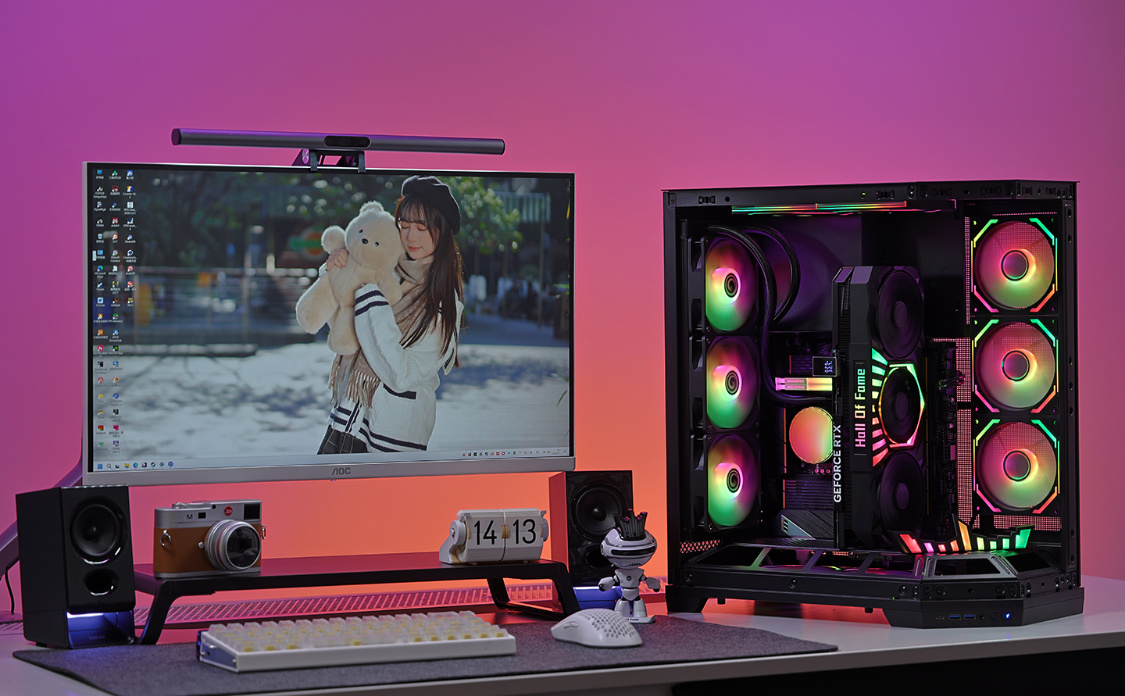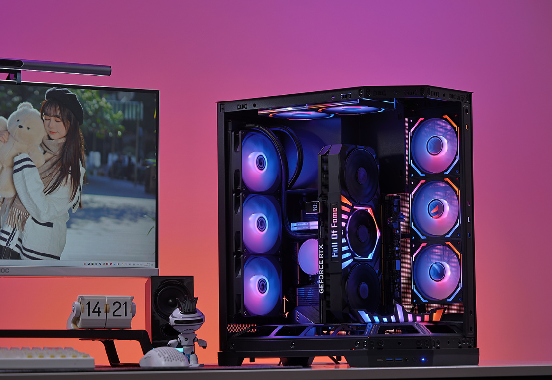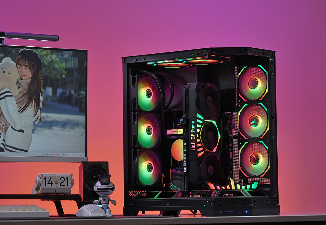 影驰空间站海景房机箱,前脸+左侧采用三段式钢化玻璃面板设计,颜值出众,辨识度还高。机箱内主板仓上方配备可拆手办台,同时大量留白可以使用冰箱贴或直接定制灯板/屏幕装饰。