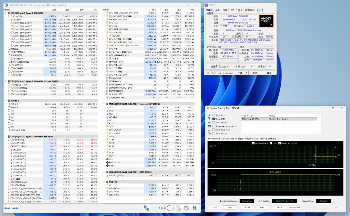 室温25度,机箱内环境,单烤FPU测试,烤机5Min,外壳温度为95°左右,CPU封装功率140W左右;