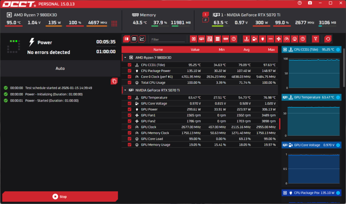 使用OCCT双烤测试,烤机5Min后,CPU温度为95°左右,CPU功耗为140W左右。显卡温度为64°左右,显卡功耗为300W左右;