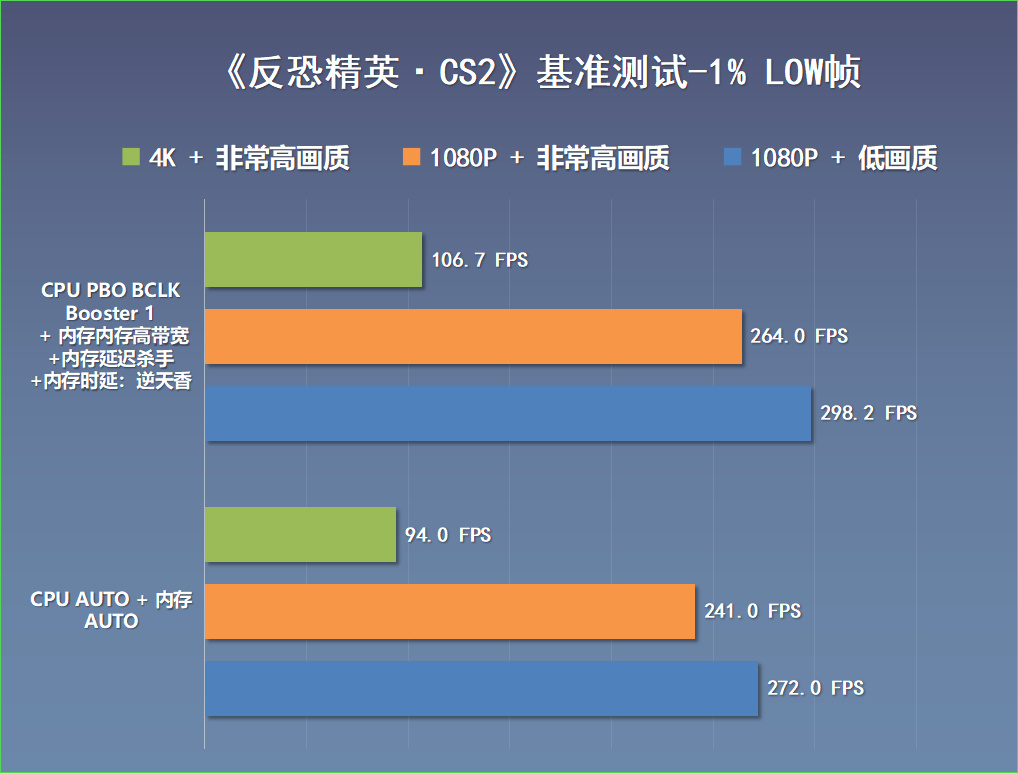 《CS2》基准测试,在CPU和内存不同状态下,分别在4K分辨率+非常高画质、1080P+非常高画质以及1080P+低画质下进行测试,游戏帧数表现如下: