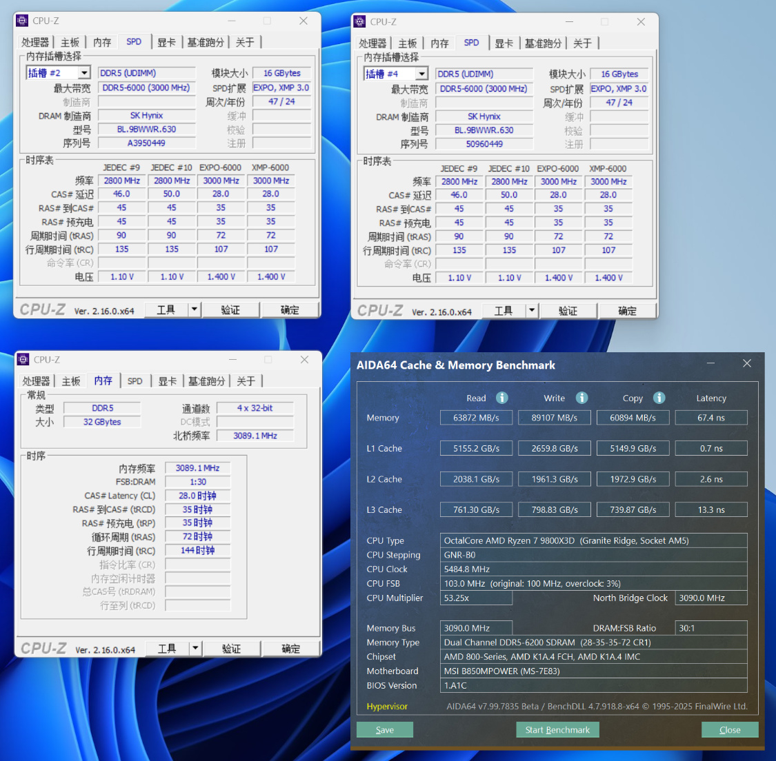 开启内存高带宽模式、内存延迟杀手,并将内存时延档位设为“逆天香”档位,读取速度为63872 MB/s,写入速度为89107 MB/s,复制速度为60894 MB/s,延时为67.4 ns;