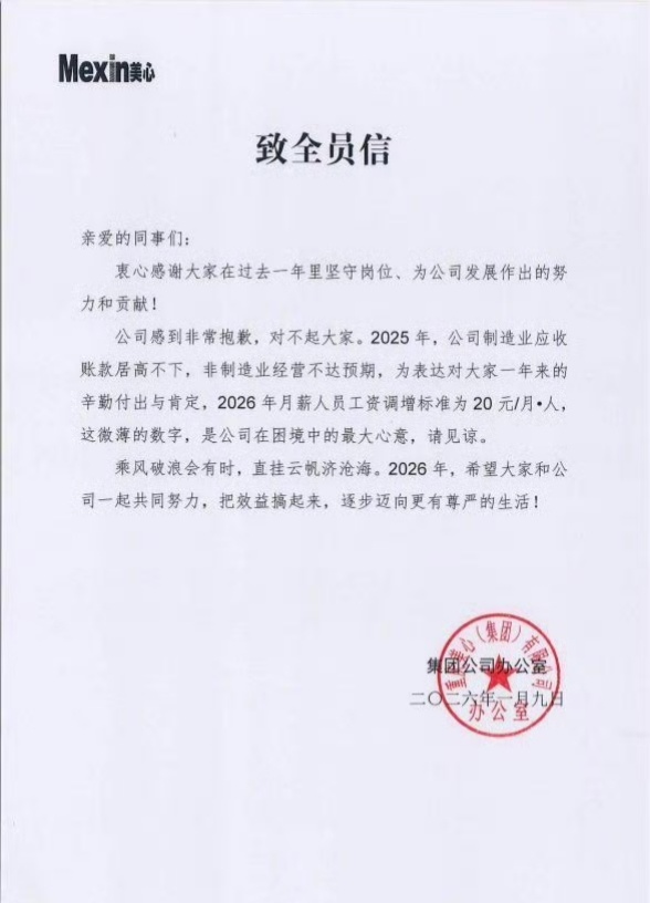重庆美心集团在2026年1月发布的致歉信中坦言,因2025年制造业应收账款居高不下、非制造业业务未达预期,只能为月薪制员工每人每月增加20元工资。公司称这“微薄的数字是困境中的最大心意”,并对涨幅过低表示“非常抱歉”。此次调薪主要针对基层员工,占公司总人数的三分之二。