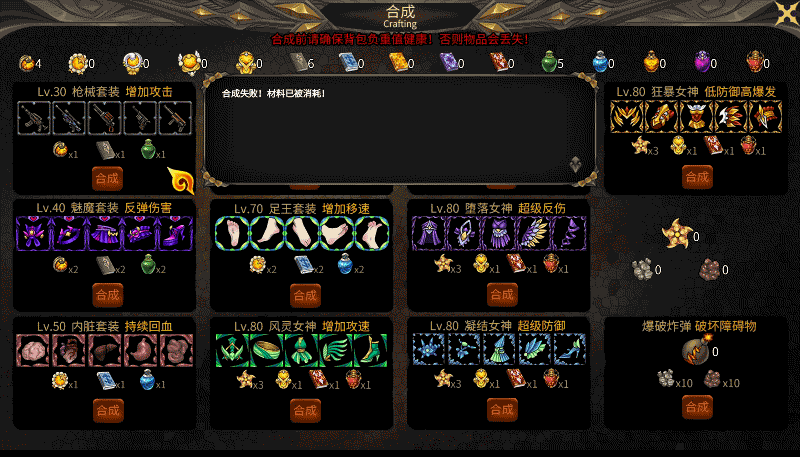 首先先随便打怪升级,差不多的时候一直打怪物掉落物,1级掉落物可以直接做30套,30套然后70套,70之后选80超高防御套,这样打最后的BOSS才不会被秒,BOSS有无敌我不建议选高攻,秒杀血量差不多4500,低于这个数就不用去碰瓷了。