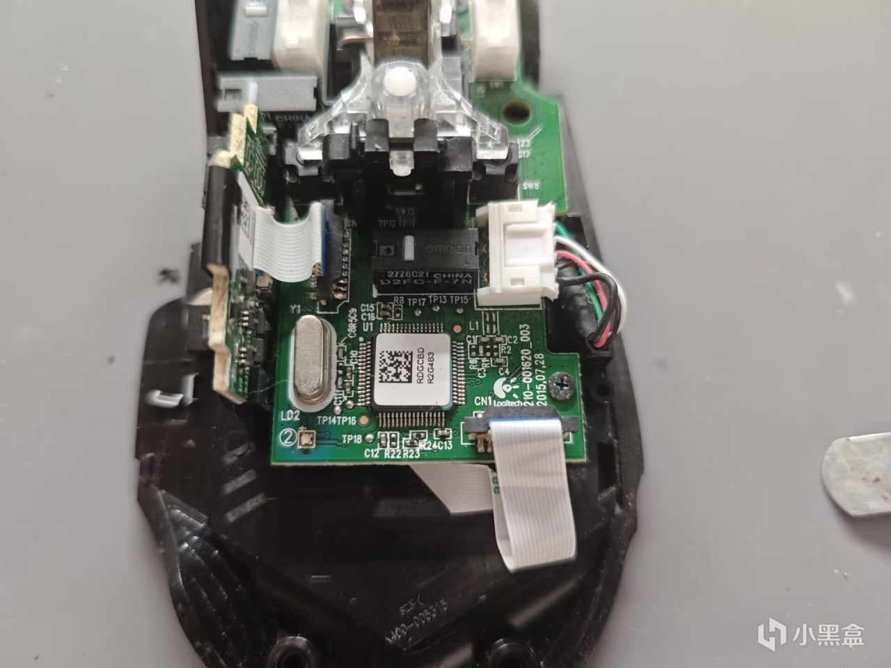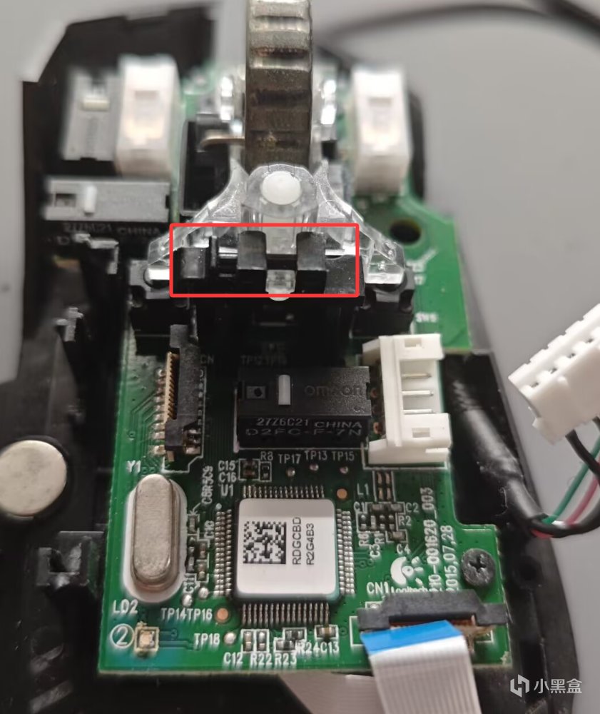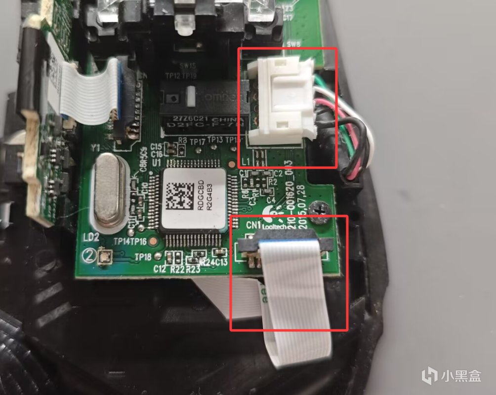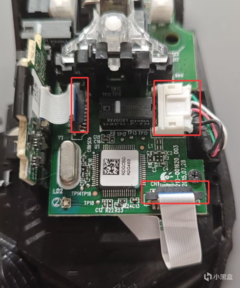 我们安装会底壳,接上图里红框的排线和数据线端口。就可以上电测试我们新换的微动是否正常了。确认正常之后我们就可以安装回全部零件,不会安装的,倒着看我的拆解教程就可以了因为写到这里的时候 G502已经给客户寄回去了,就没安装回去的教程了,而且篇幅也很长了。好了,本次教程到处结束。感谢大家的观看