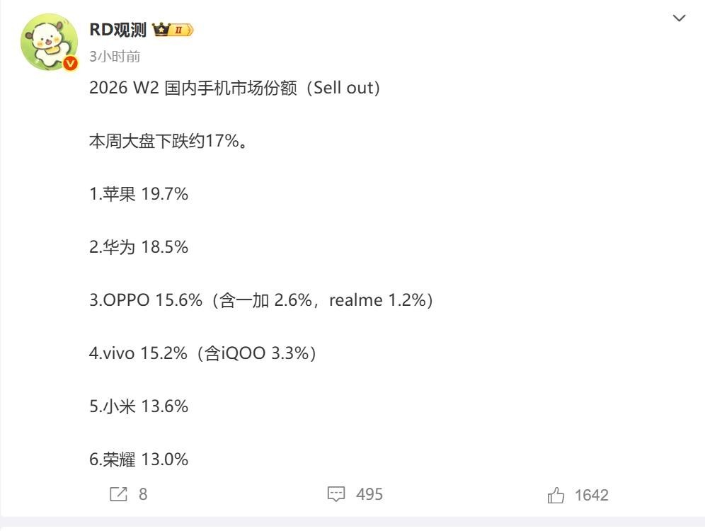 2026年国内手机行业的竞争加剧,不管是品牌层面还是机型层面都进入了拉锯战。2026年W2单机销量榜出炉,根据博主“RD观测”提供的数据,苹果17Pro再次超越华为Mate80重回第三,苹果霸榜前三的局面重现。华为Mate80排名比上周下降一位,依然稳居前四,依然是销量最高的国产手机,也是国产高端手机的脸面。