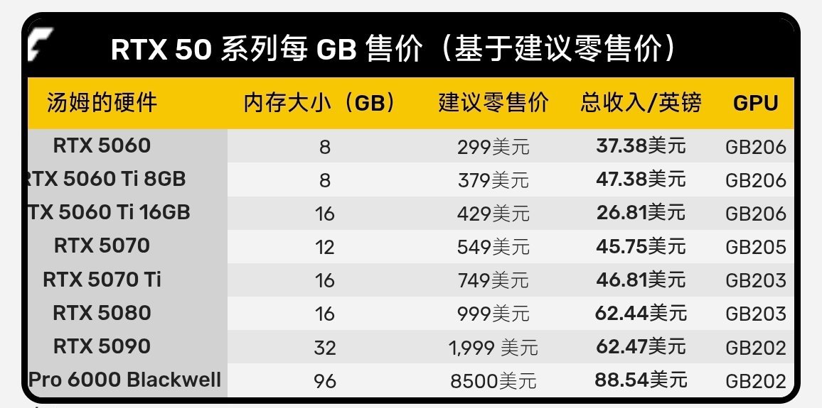 50系图表总结如上,但这是按建议零售价算的,5090实际售价已经是建议零售价的二倍了,所以每gb收入也要翻倍