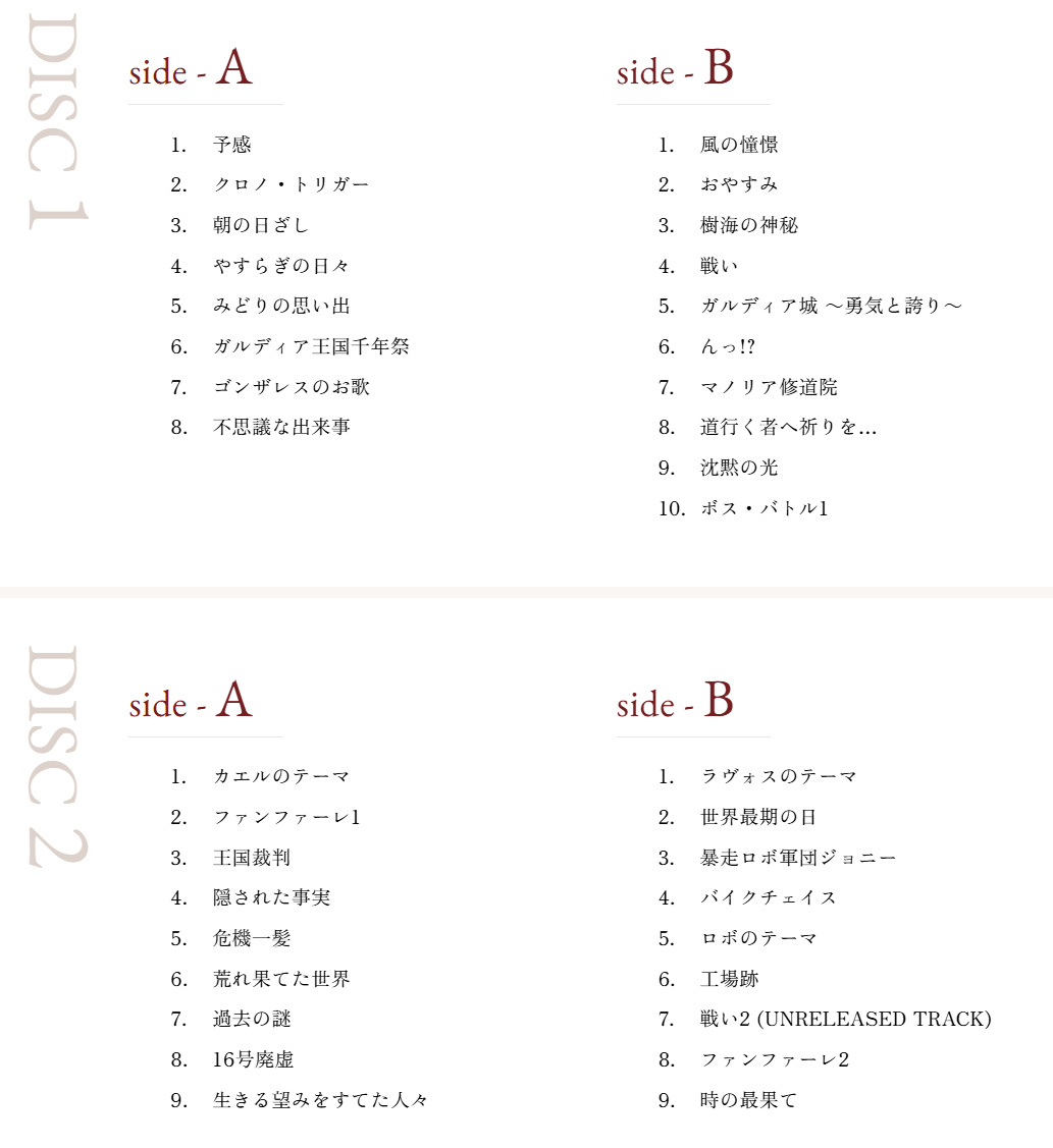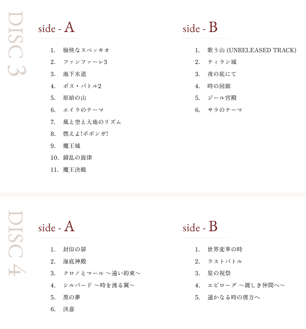 此套裝包含4張黑膠唱片,收錄《超時空之輪》原聲帶中64首曲目,日本售價爲17,600日元,北美地區預購價爲174.99美元。完整曲目列表請查看《超時空之輪》原聲黑膠套裝官方網站。