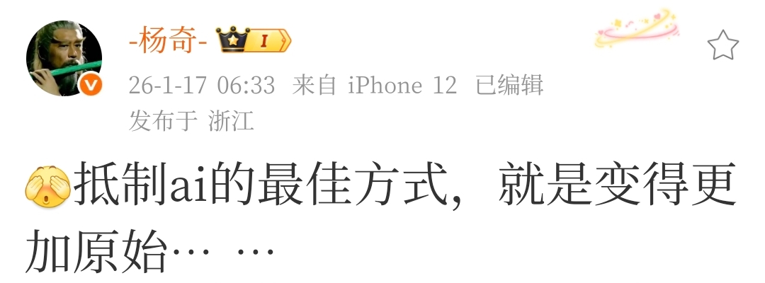 《黑神話:悟空》美術總監楊奇在2026年1月17日中國時間早上6點,於社交媒體發佈動態,文字內容爲:“抵制ai的最佳方式,就是變得更加原始… …”,並附上了三張照片。這條帖迅速引發玩家熱議,不僅因爲其幽默自嘲的調性,還因爲配圖透露出的“幕後黑料”,讓評論區瞬間變身“福爾摩斯偵探團”。
