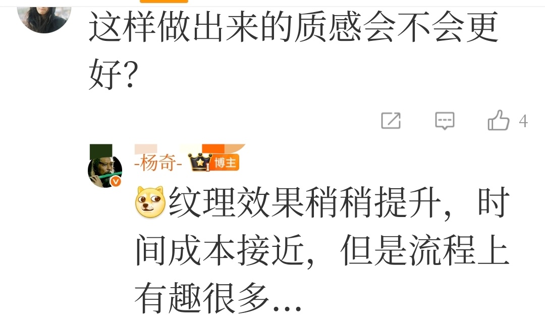 熱心網友提問:這樣做出來的質感會不會更好?楊奇回答:紋理效果稍稍提升,時間成本接近,但是流程上有趣很多…