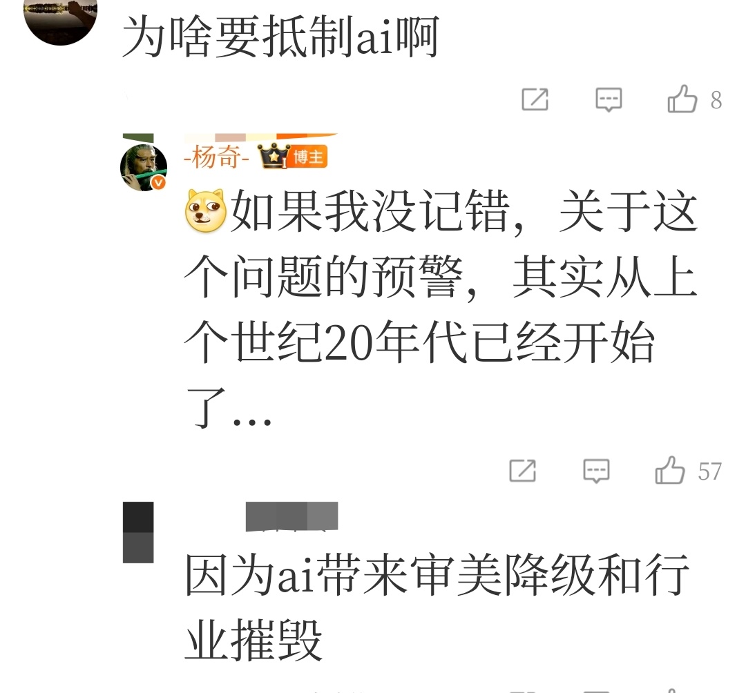 有熱心網友提問:爲啥要抵制ai啊?楊奇回答:如果我沒記錯,關於這個問題的預警,其實從上個世紀20年代已經開始了...