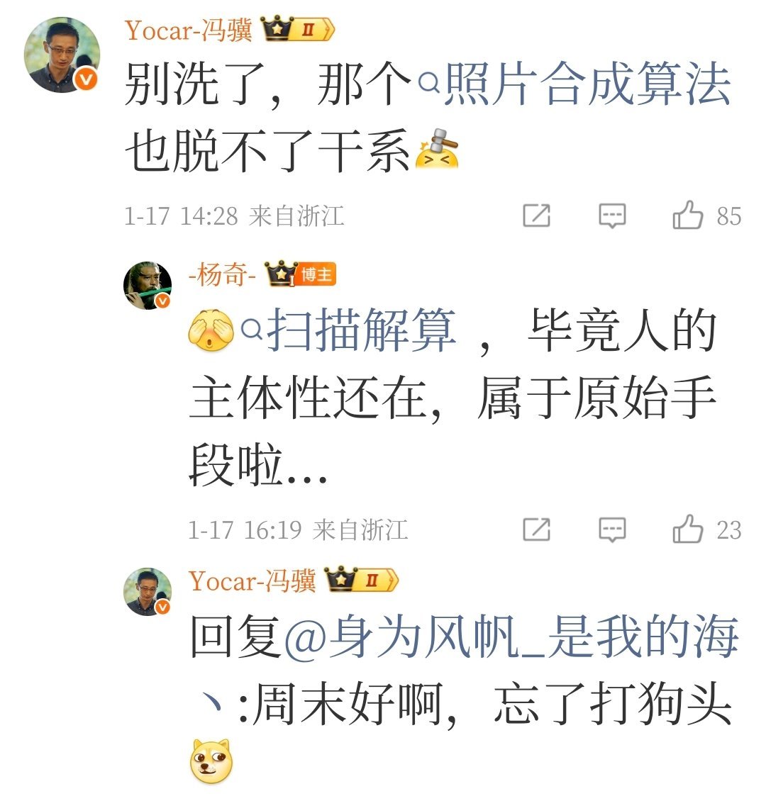 馮驥現身評論區:別洗了,那個照片合成算法也脫不了干係,楊奇回答:畢竟人的主體性還在,屬於原始手段啦...