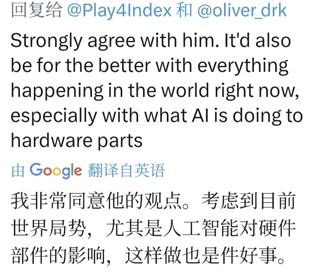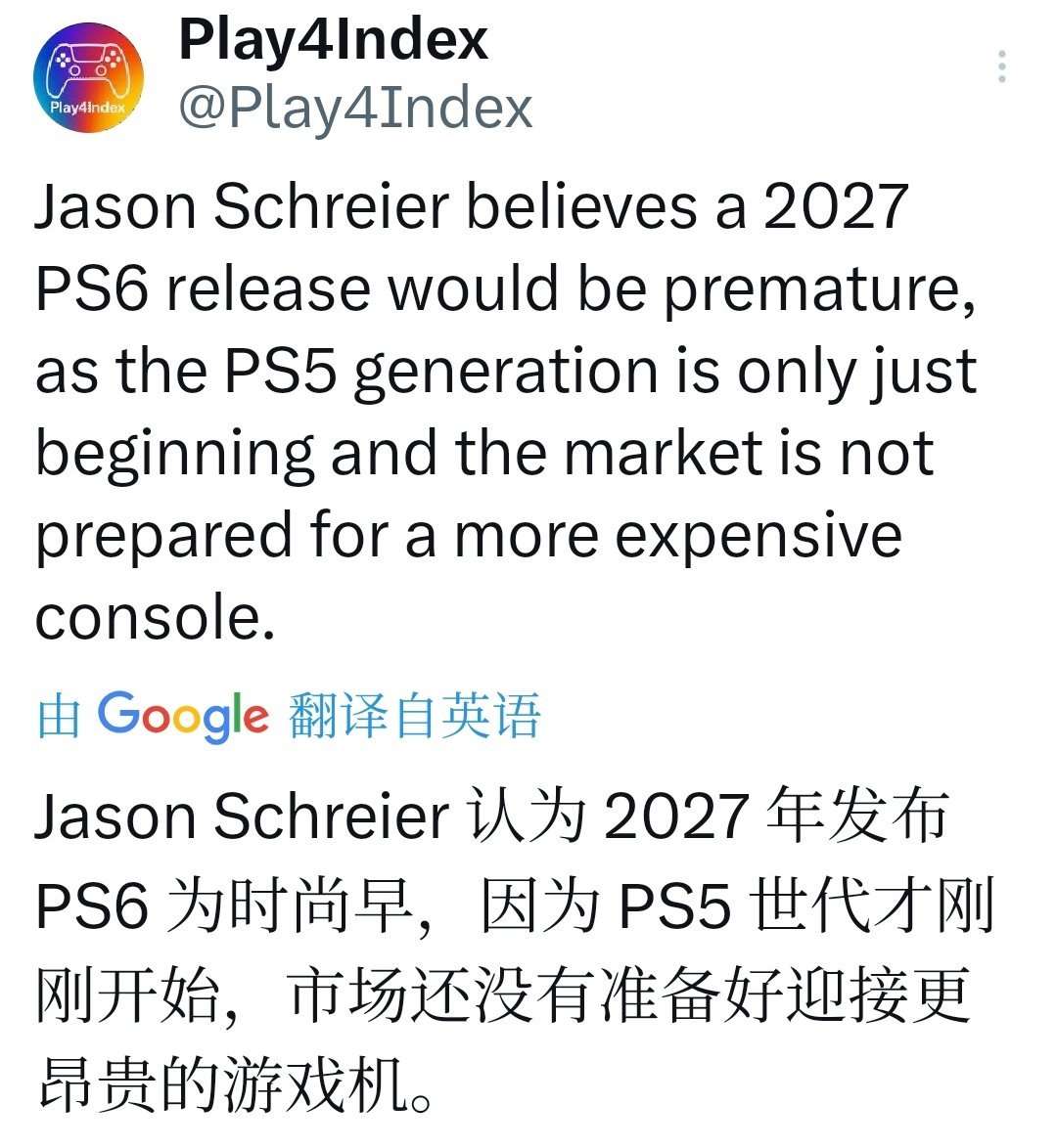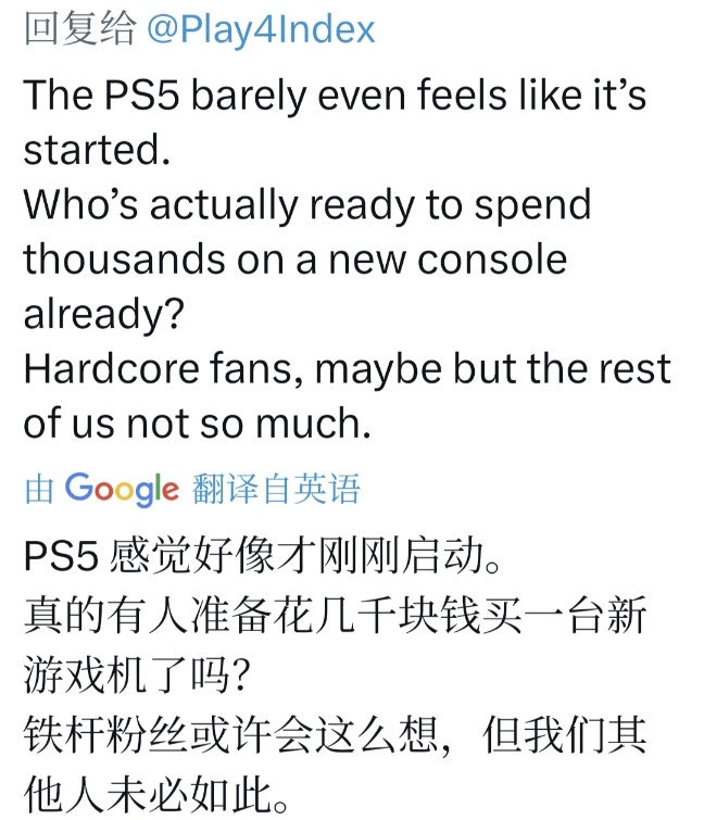 X上,施赖尔粉丝和玩家共鸣:PS5 “刚起步”,无需急换,“现世代主机潜力才刚展现,现在换代是战略错误。”“推一台更贵的主机……给谁?除了硬件发烧友,没市场。”他点出:2027 年消费者不会为“升级”买单,尤其经济低迷。