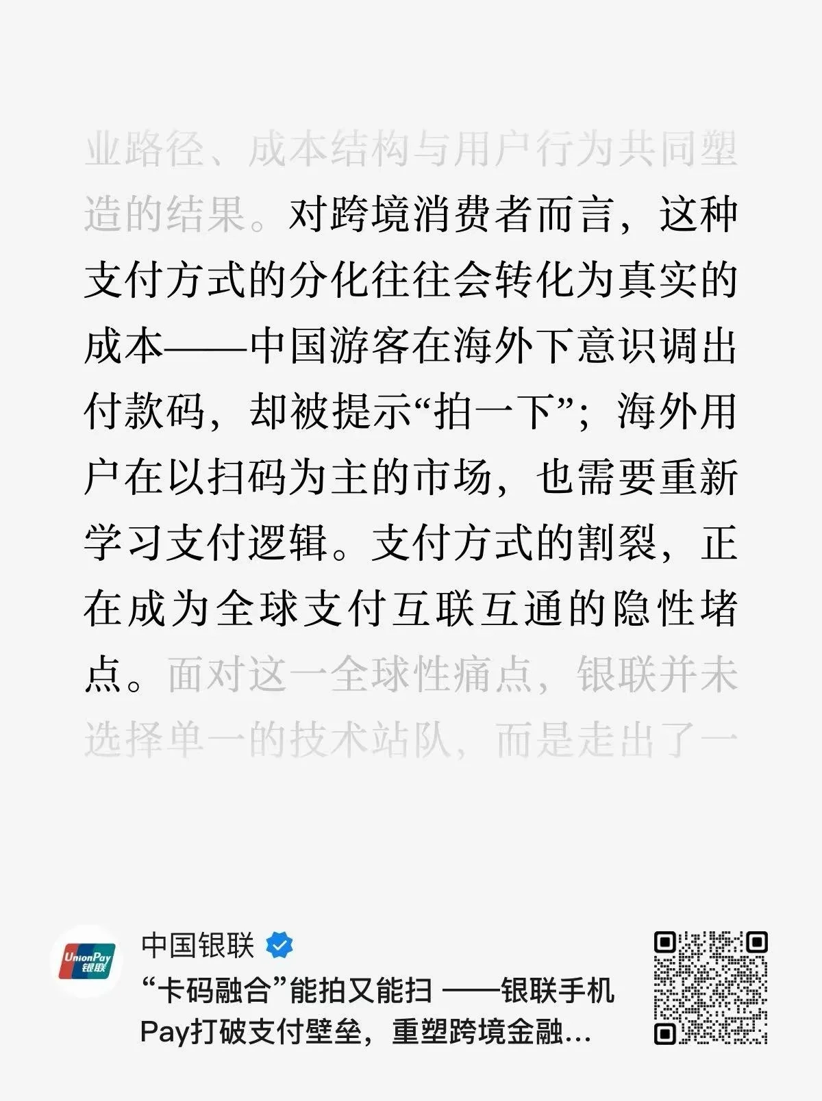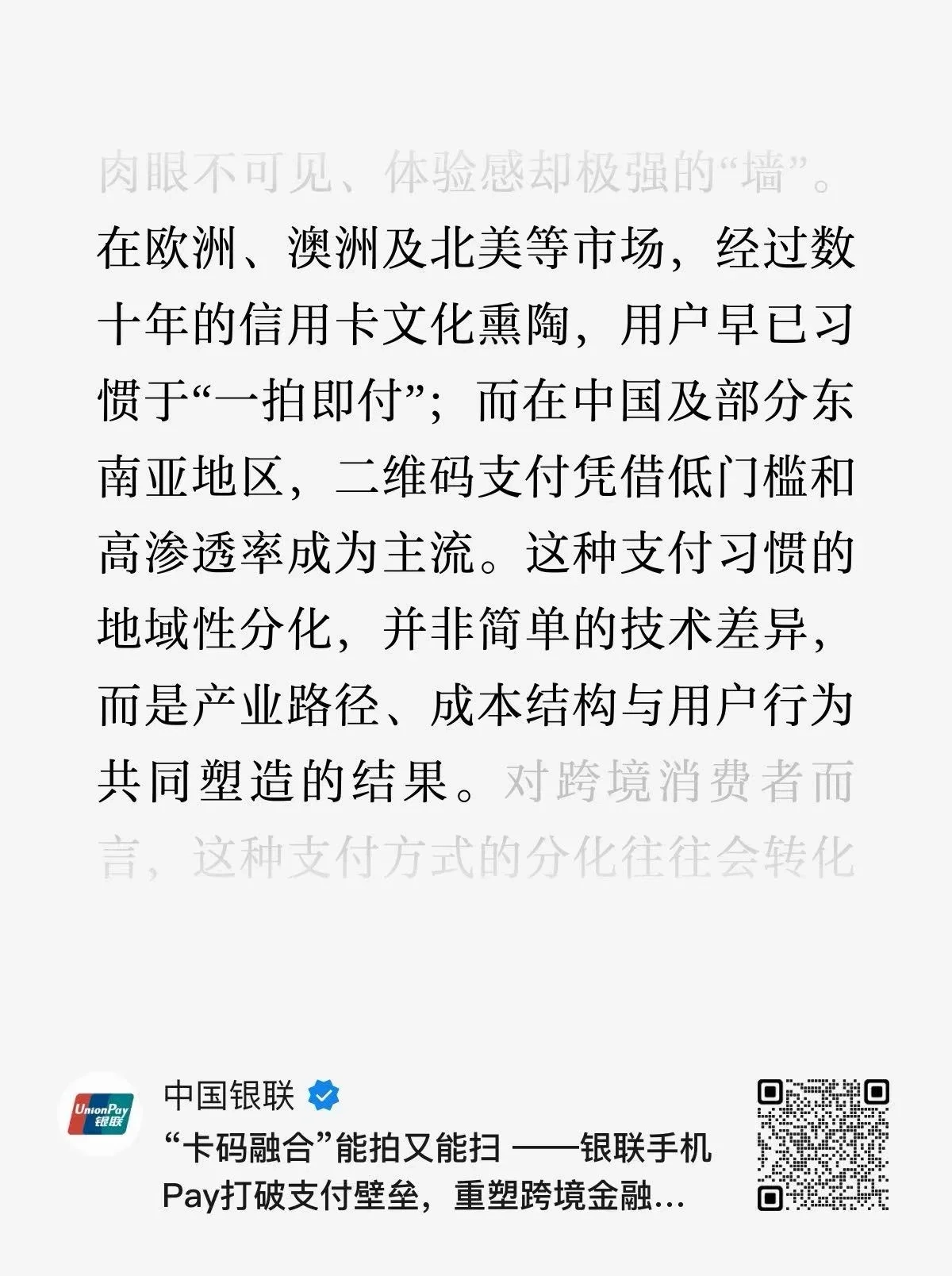 对跨境消费者而言,这种支付方式的分化往往会转化为真实的成本——中国游客在海外下意识调出付款码,却被提示“拍一下”;海外用户在以扫码为主的市场,也需要重新学习支付逻辑。支付方式的割裂,正在成为全球支付互联互通的隐性堵点。