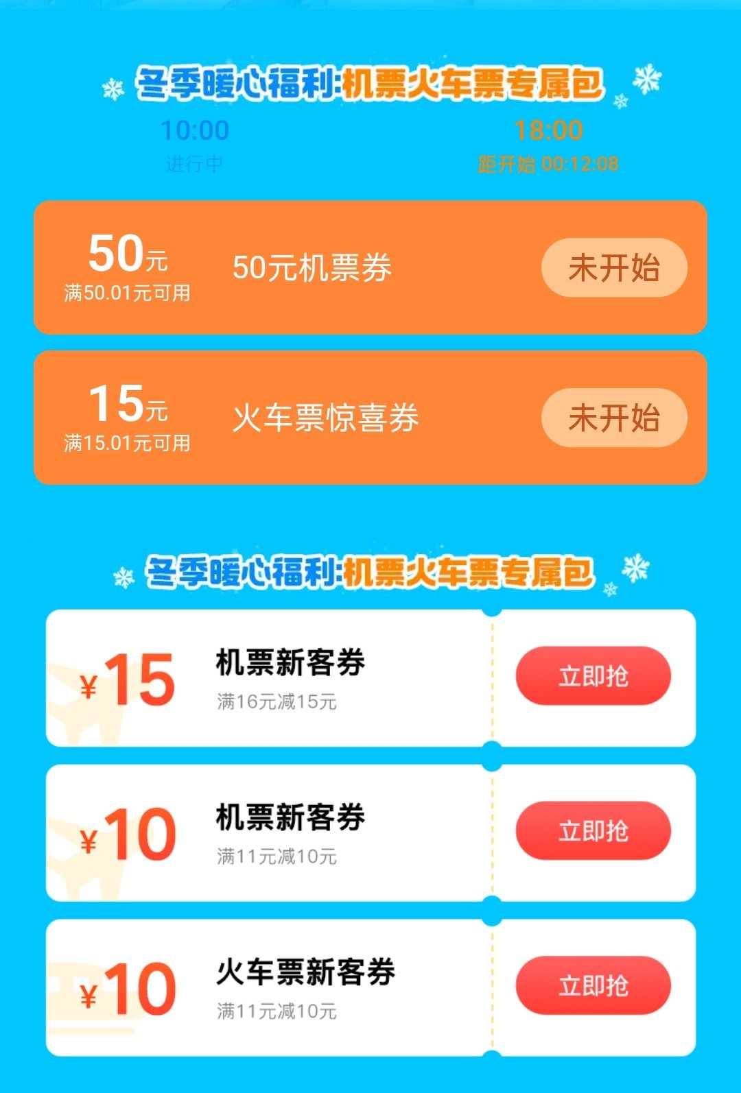 火车高铁:1张15元无门槛卷,2张10元无门槛卷,还有2张5元无门槛卷。
