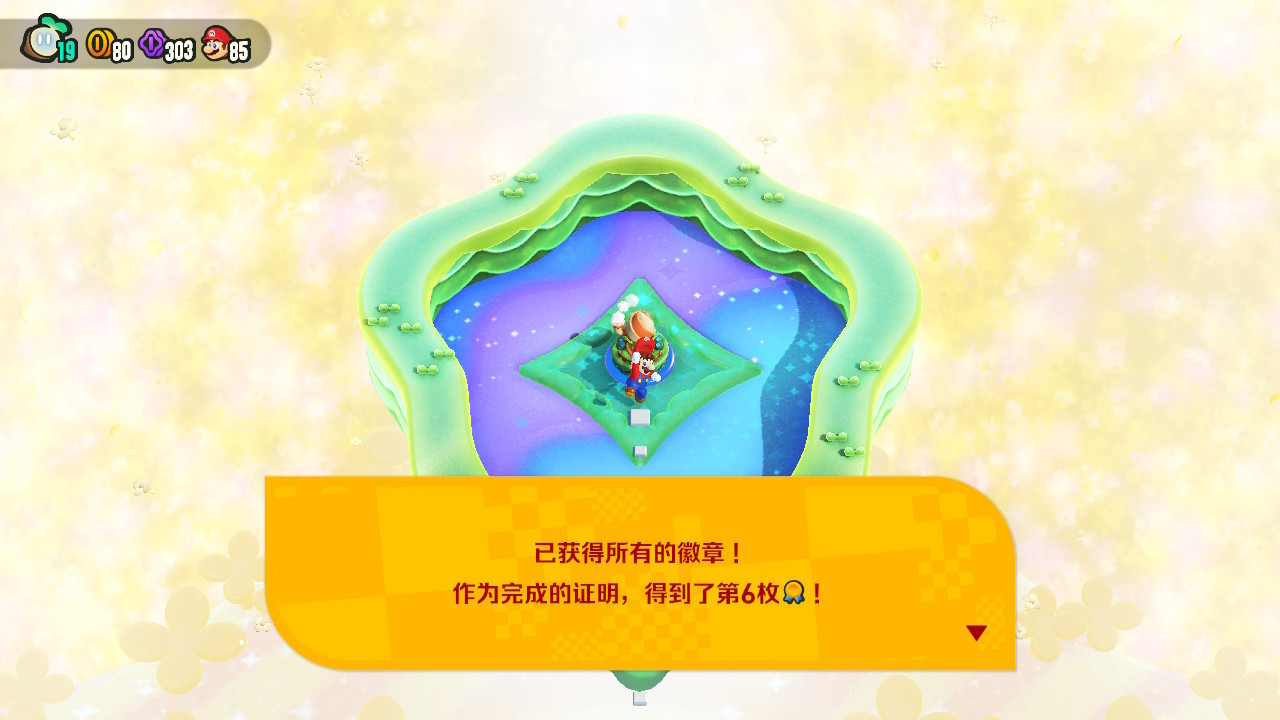 【9】 100%。 惊奇全收集后去打了徽章总动员的一命银(笑),仅是底力到了。流程兼具了轻度有趣和一定的可玩性,并以极致堆料且富有创意的设计带给了我长达二十多小时的收集旅途的体验,着实是纯粹而惊奇的快乐。