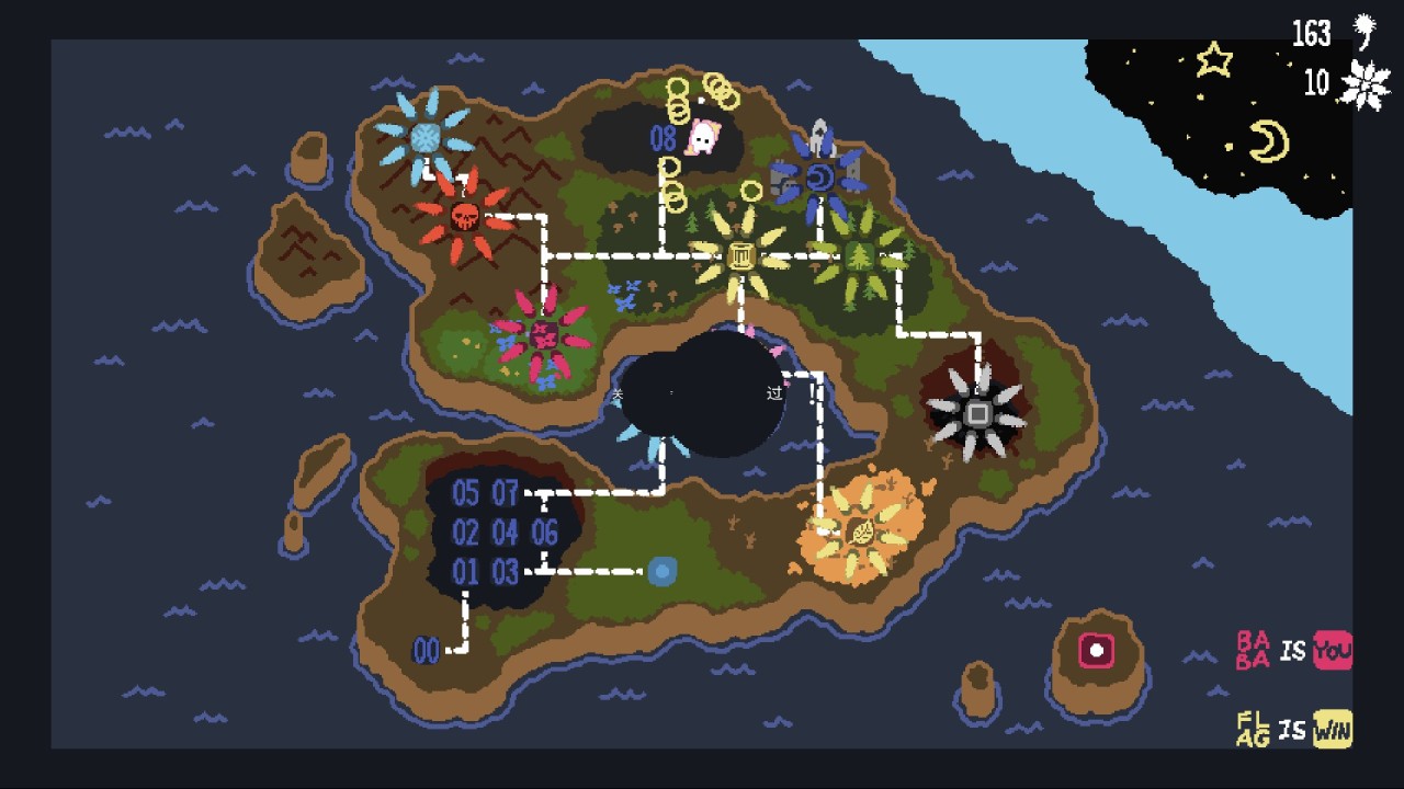 【9】 表结局100%。 类推箱,点子解谜。规则可变,引导逆向,baba is you 的解谜过程像是对“障碍”进行抽丝剥茧,游戏会要求你在往前关卡中汲取经验,又会要求你在新的一关中打破思维定式。规则多变,数百关卡之语句交互充满无限可能,规则间相互影响又互相制约,有些变化则难免是奇特的,解题诀窍可能是一个新奇语句,又可能是一个事先预料又恰到好处的物体摆放,更可能是润物细无声下的思路进阶, 在交互之下,在往前关卡中所获得的那些源自baba is you本身的“知识”,往往也能让你思考后构筑的规则如同精密的程序般直击作者的点子。