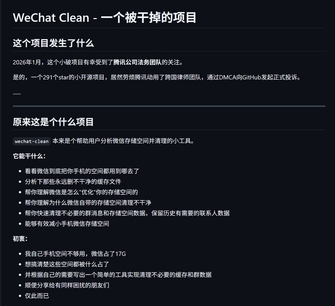 Github要求作者提交抗辩或在一个工作日删除仓库,作者选择了后者,很可惜以后还是只能用微信自带的“删除工具”