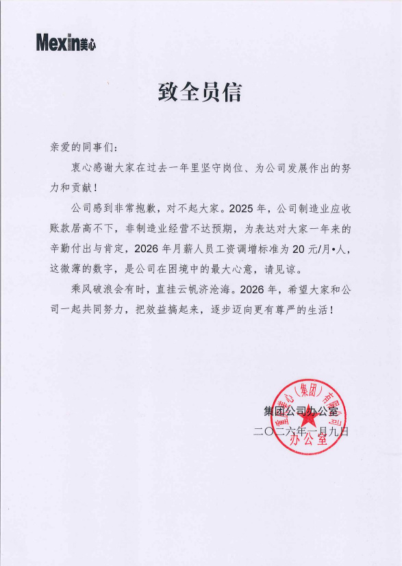 近日,重慶美心集團一份關於2026年度調薪的致歉信受到關注。信中稱,今年公司決定爲基層員工漲20元月薪,並對漲幅較低表達歉意,“非常抱歉,對不起大家”。