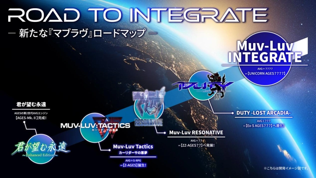 顾名思义,“ROAD TO INTEGRATE”是以完成《Muv-Luv INTEGRATE》的开发作为最终目标的作品开发计划,这是一个与《Muv-Luv Dimensions》等“社交游戏”无关,原作者吉宗钢纪重度参与的计划,它由松村和俊在反思和吸取了此前的失败经验后所提出,重新整理了2019年时一口气抛出的多个新作计划,并用一种明示了阶段性目的与项目优先级的方式,向粉丝们展示了“Muv-Luv”系列在未来的发展方向。