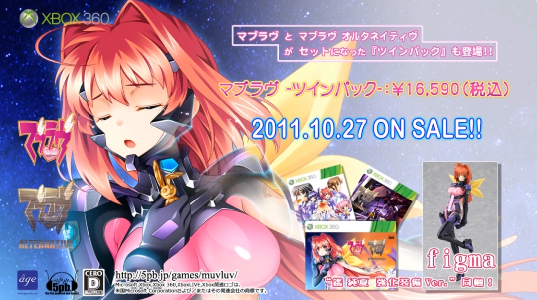 2011年,《Muv-Luv》与《Muv-Luv Alternative》的首个主机移植版本在Xbox 360平台发售,发行商是与中西社长熟悉的,在“文字冒险类游戏”上还有着不错成绩的MAGES.(5pb.)。当时,正值Xbox 360与PlayStation 3交锋的白热阶段,除了《命运石之门》这样专门针对日本市场企划开发的原创作品外,Xbox更对各类既有的美少女游戏,表现出了极其包容的态度,几乎所有人都在这次主机版移植上铆足了力气,不仅重新制作与收录了专用的主题曲,还专门推出了包含“鉴纯夏强化装备版figma”的豪华版。
