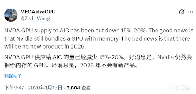 根据爆料人 MEGAsizeGPU 的消息,NVIDIA 近期已将 GPU 供应量对 AIC 合作伙伴削减了 15% 至 20%,这一举措可能进一步推高显卡价格,使当前的显卡供应紧张局面持续甚至恶化。他还指出,尽管供应减少,NVIDIA 仍会继续将 GPU 与显存捆绑销售,而非像此前传言那样分开供应,不过在整体供应紧缩的背景下,捆绑策略的影响已相对有限。