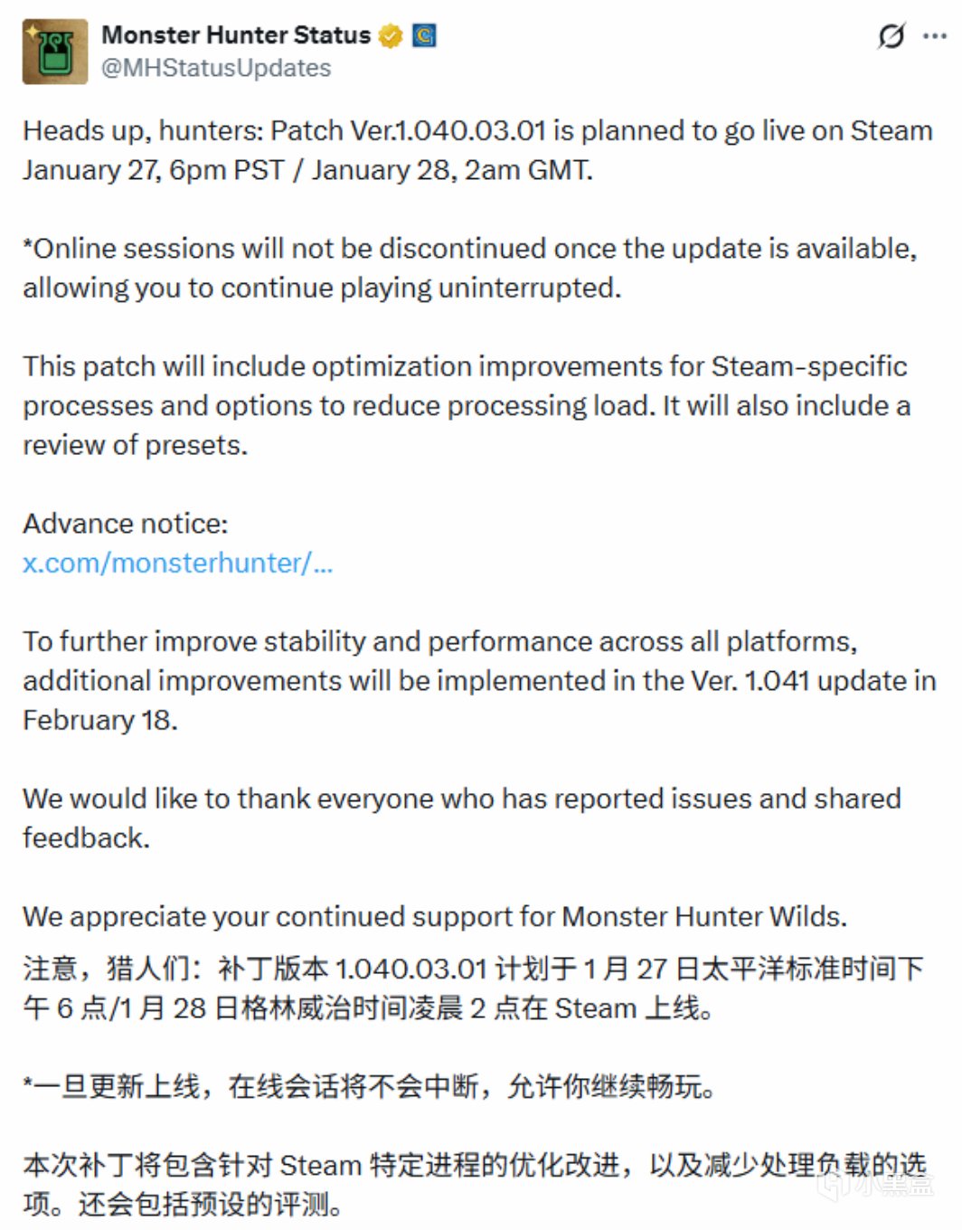1月28日北京时间上午10点,《怪物猎人:荒野》性能更新中专为 PC 版本设计的更新将正式上线。
